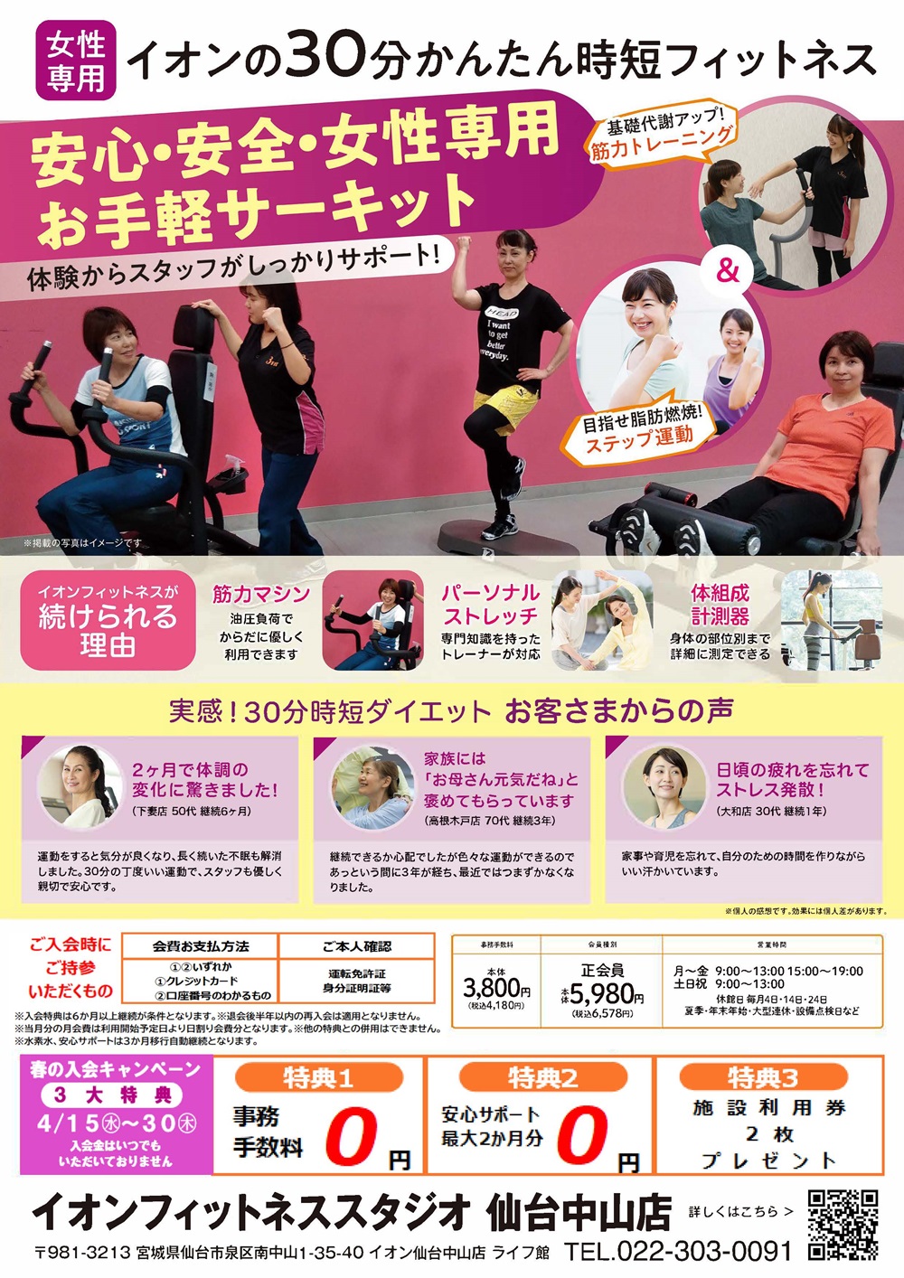 イオン仙台中山専門店街内にある 初心者でも安心して気軽に行える女性専用の30分サーキットトレーニングスタジオです。