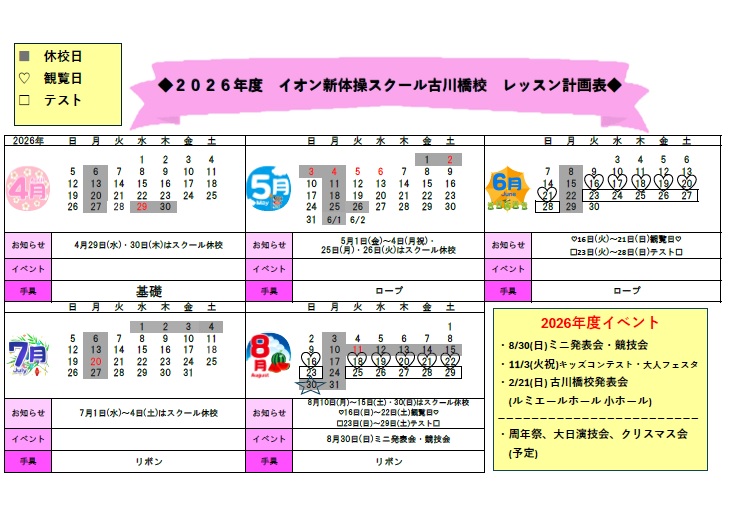 【古川橋校】2026年4月~8月 レッスンカレンダー