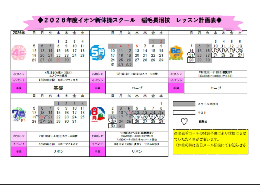 【稲毛長沼校】2026年度4月~8月レッスン計画表