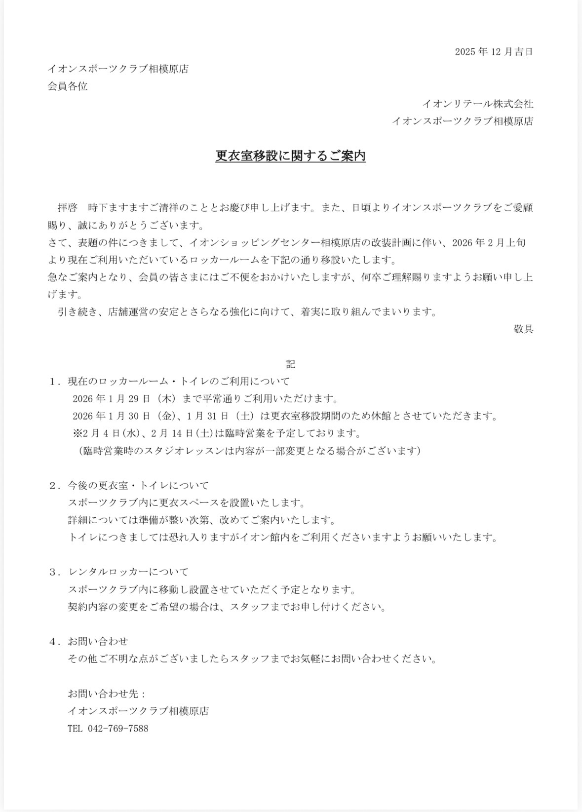 【重要】イオンスポーツクラブ3FIT相模原店更衣室移設に関するご案内