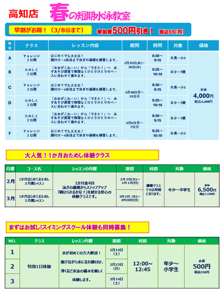 【高知店 春の短期スイミング教室】