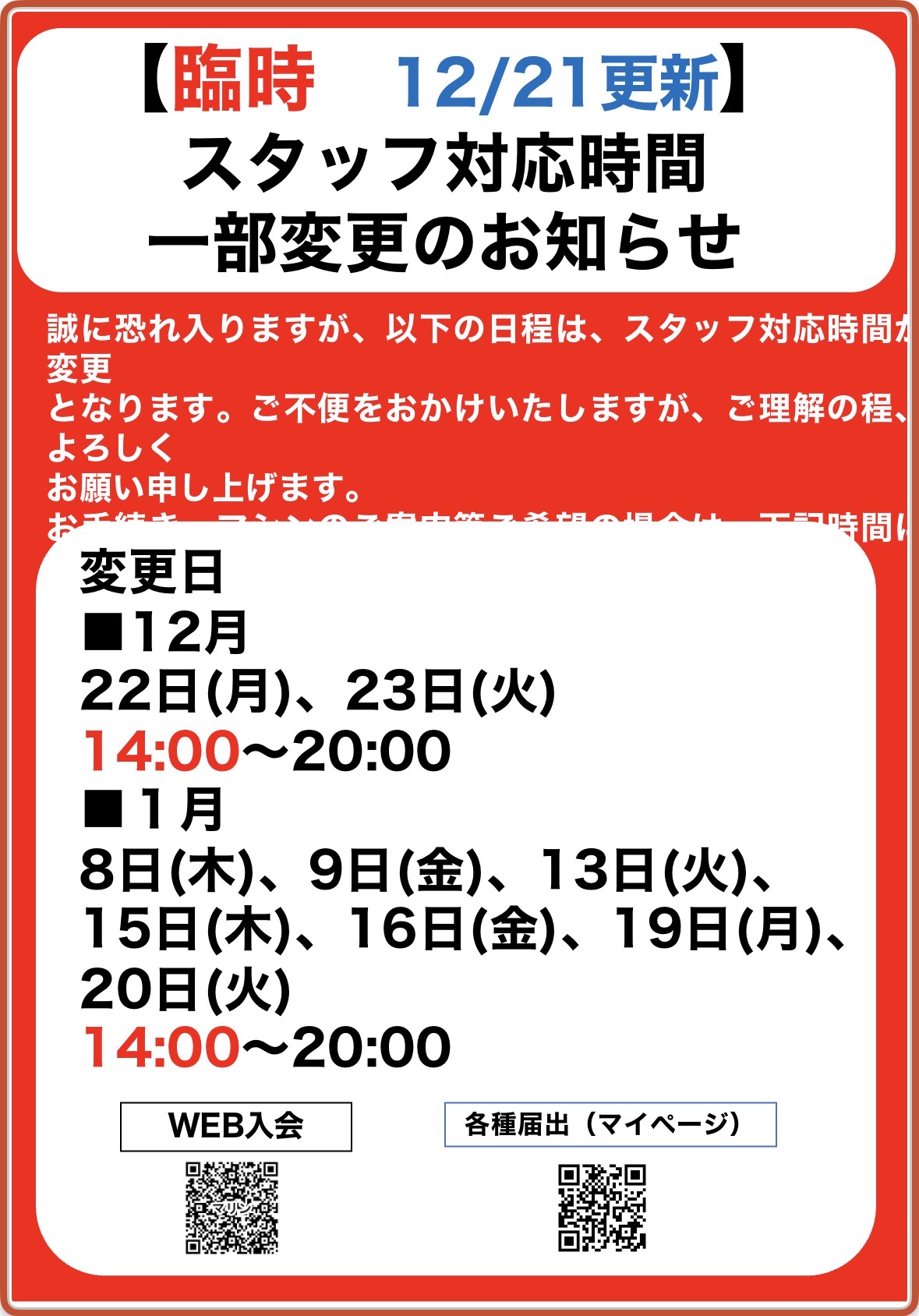 【臨時 12/21更新】 スタッフ対応時間 一部変更のお知らせ