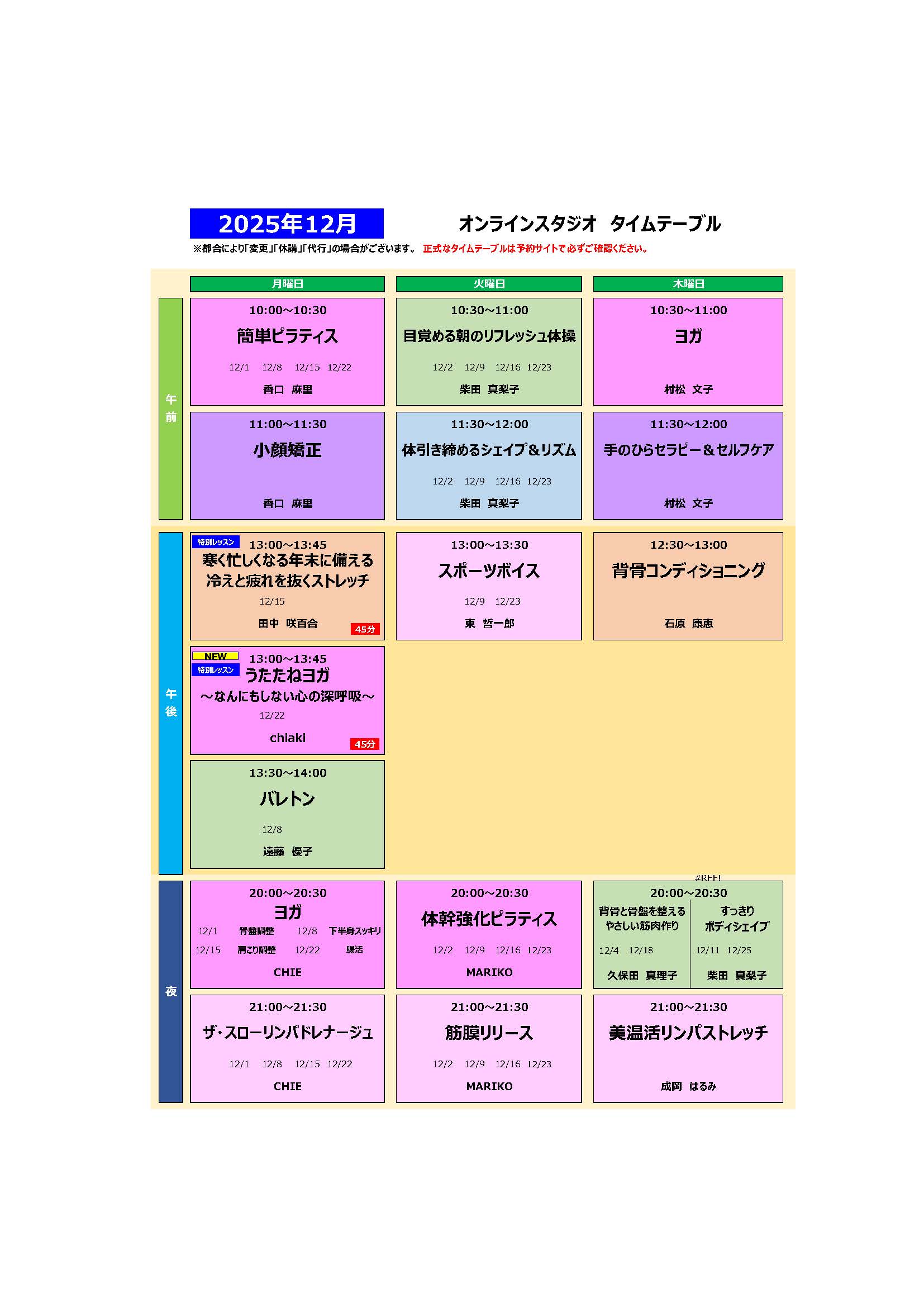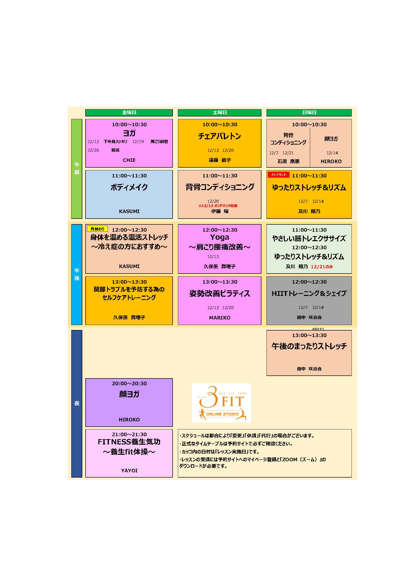 【3FITオンラインスタジオ】レッスンタイムテーブル12月