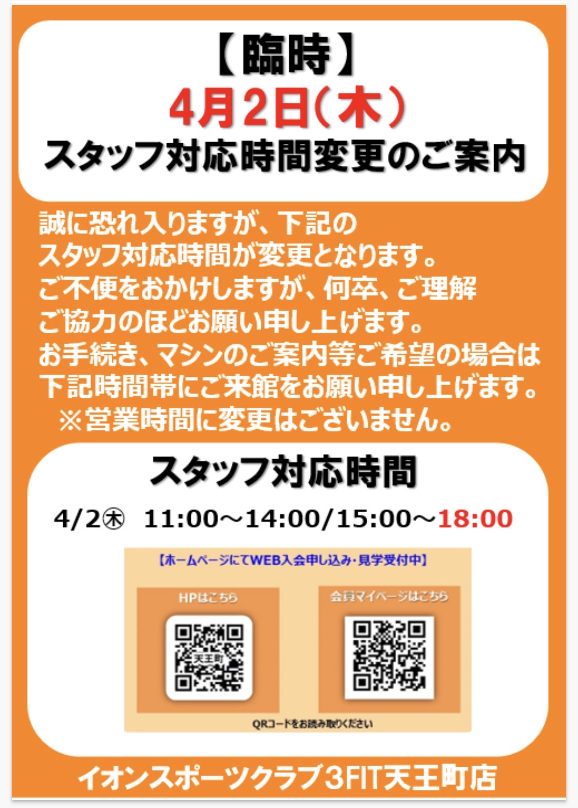 【3FIT天王町】スタッフ対応時間変更