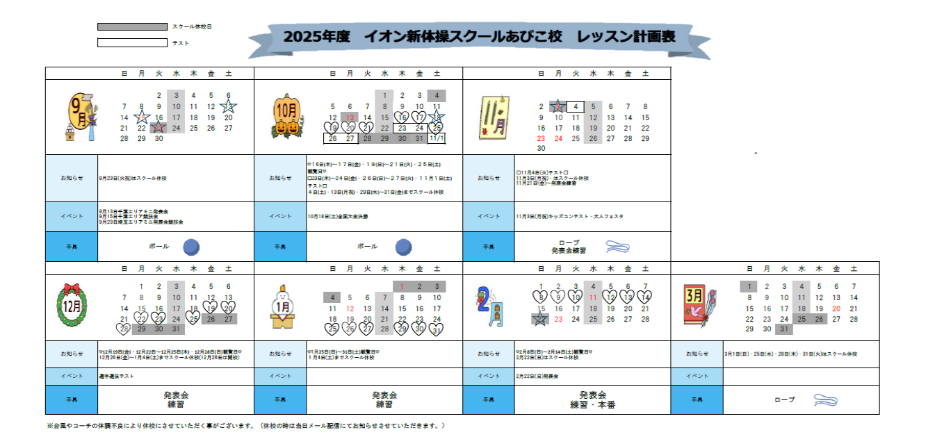 あびこ校 2025年10月~2026年3月レッスン計画表