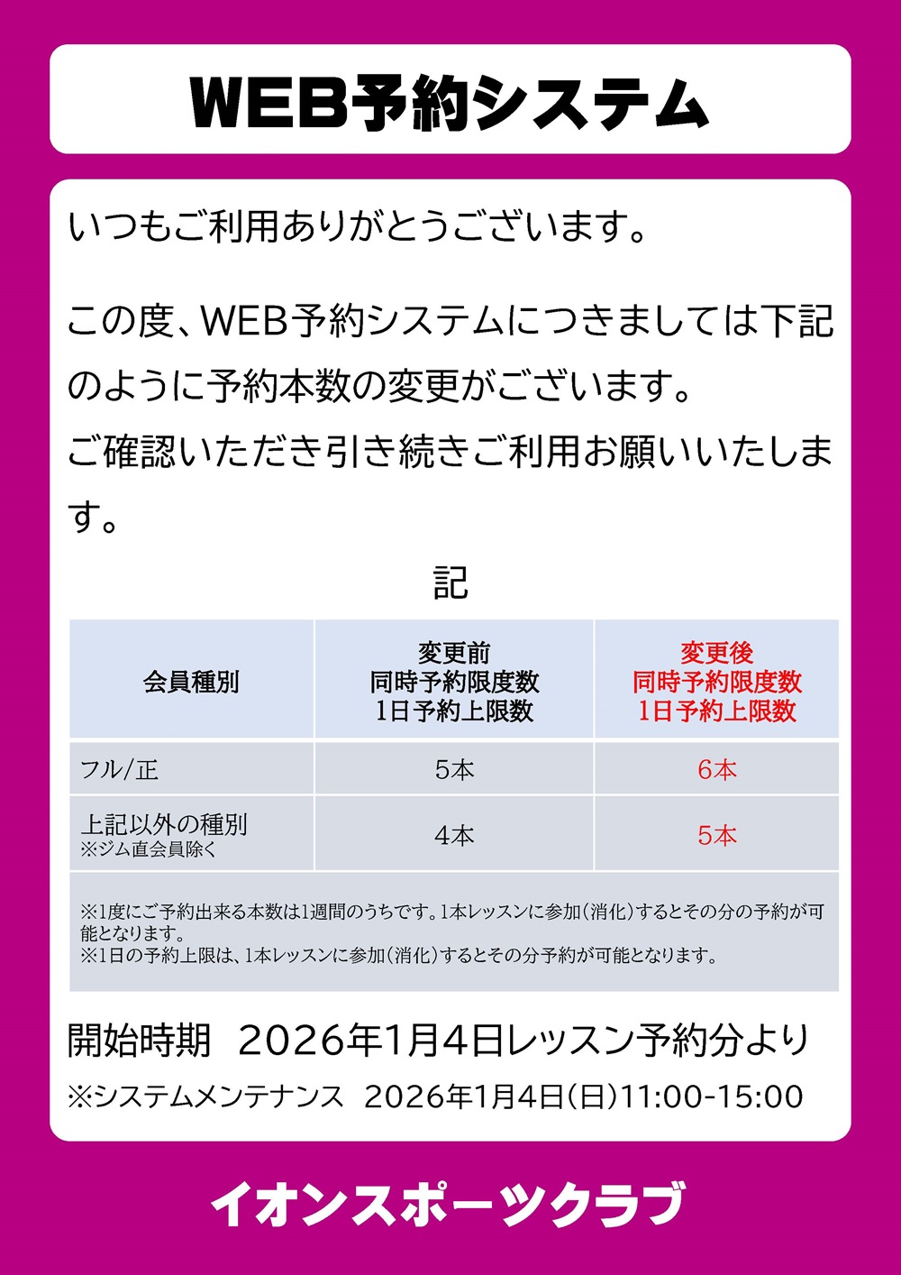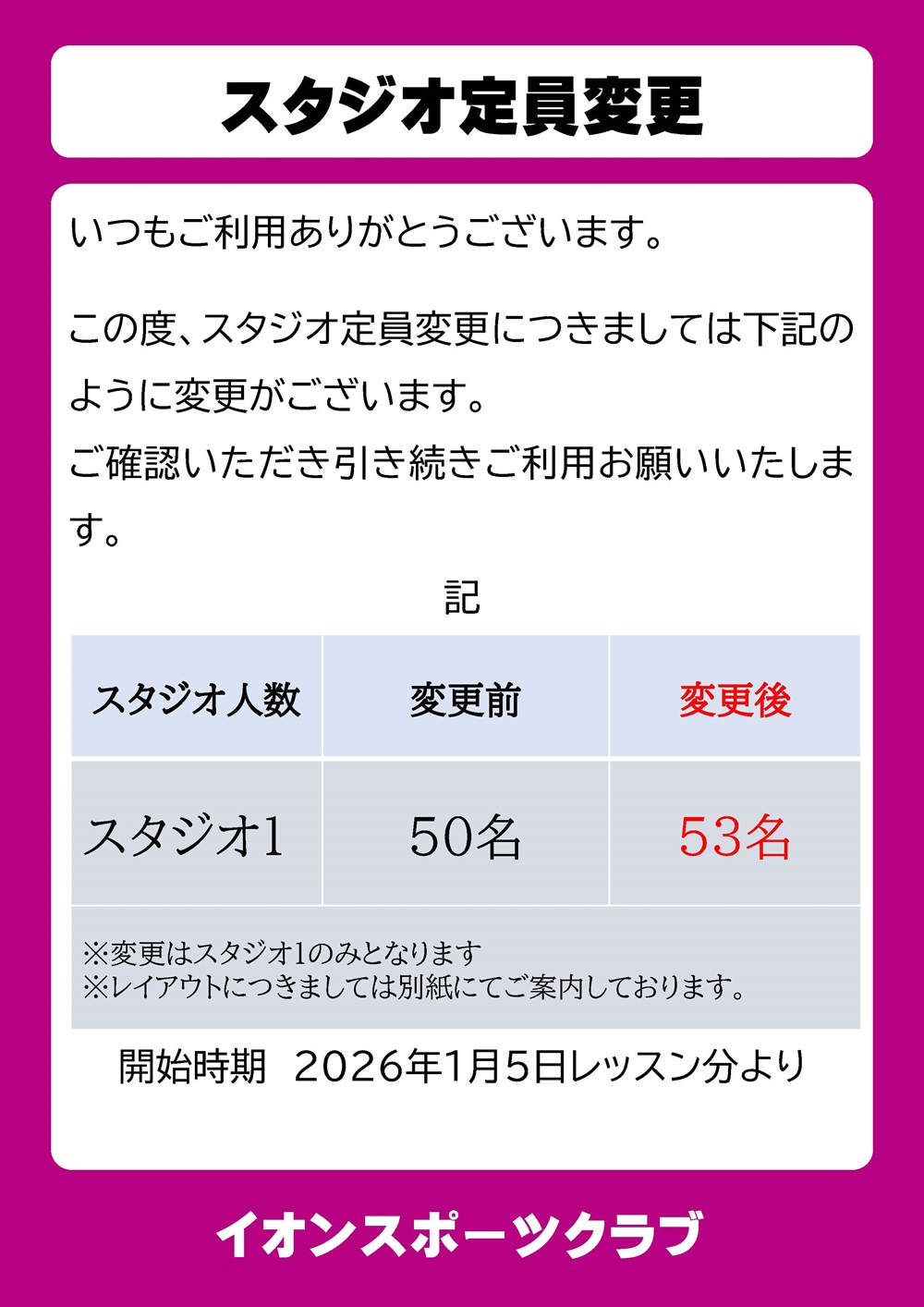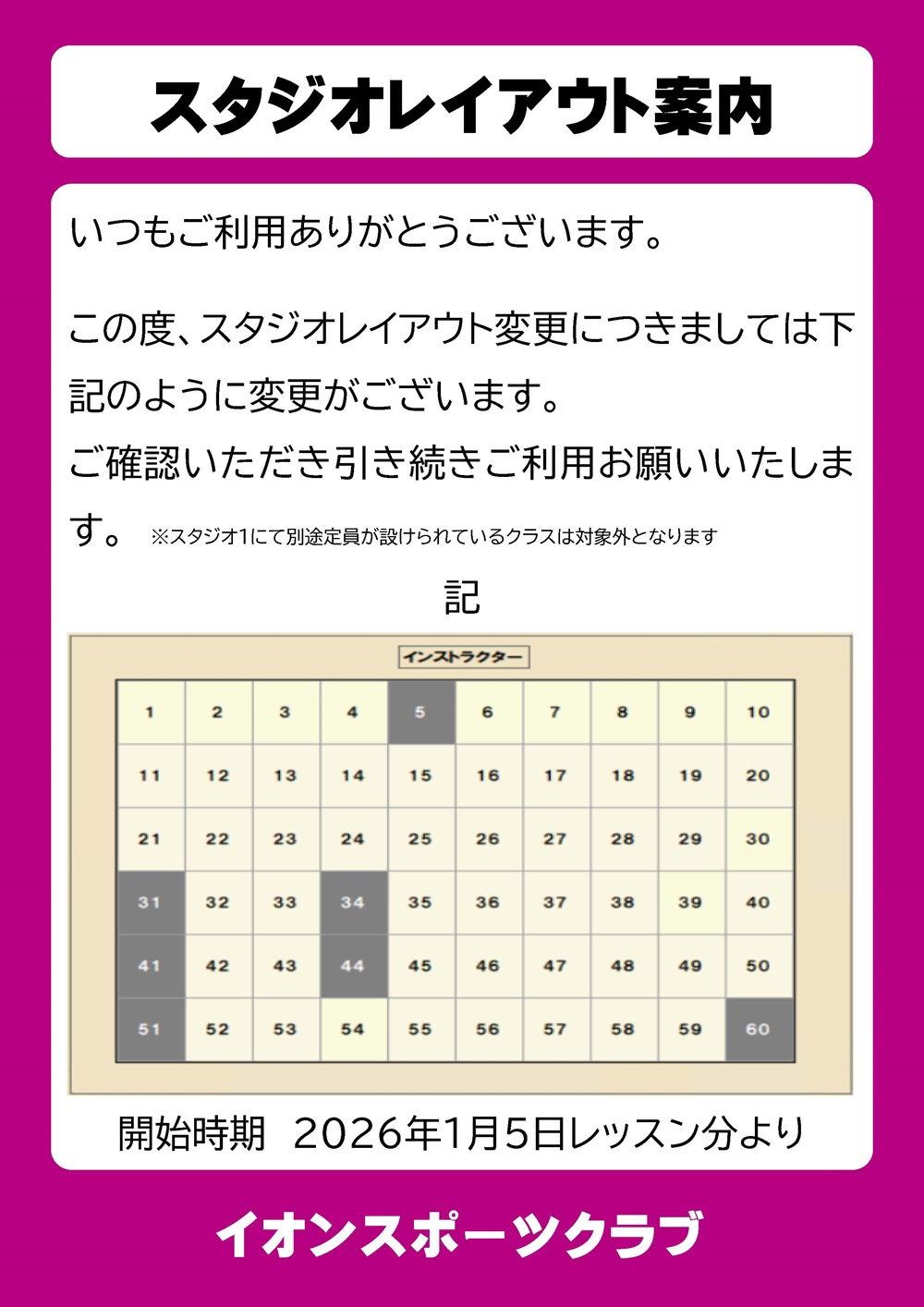 おゆみ野店 スタジオレッスン変更についてのお知らせ
