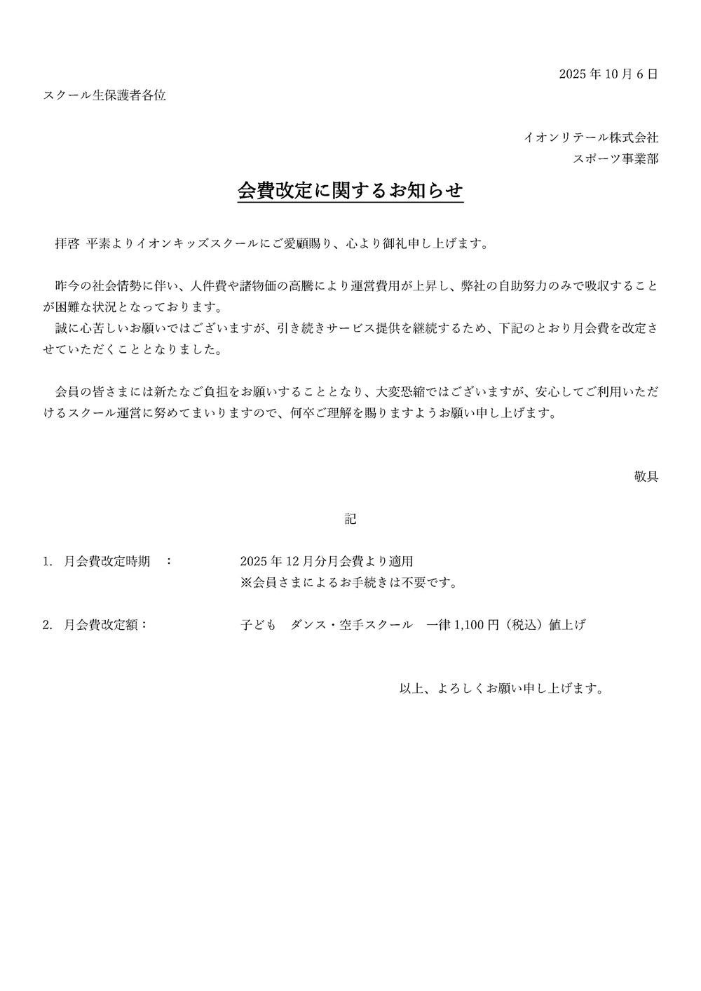 おゆみ野店 キッズスクール会費改定に関するお知らせ