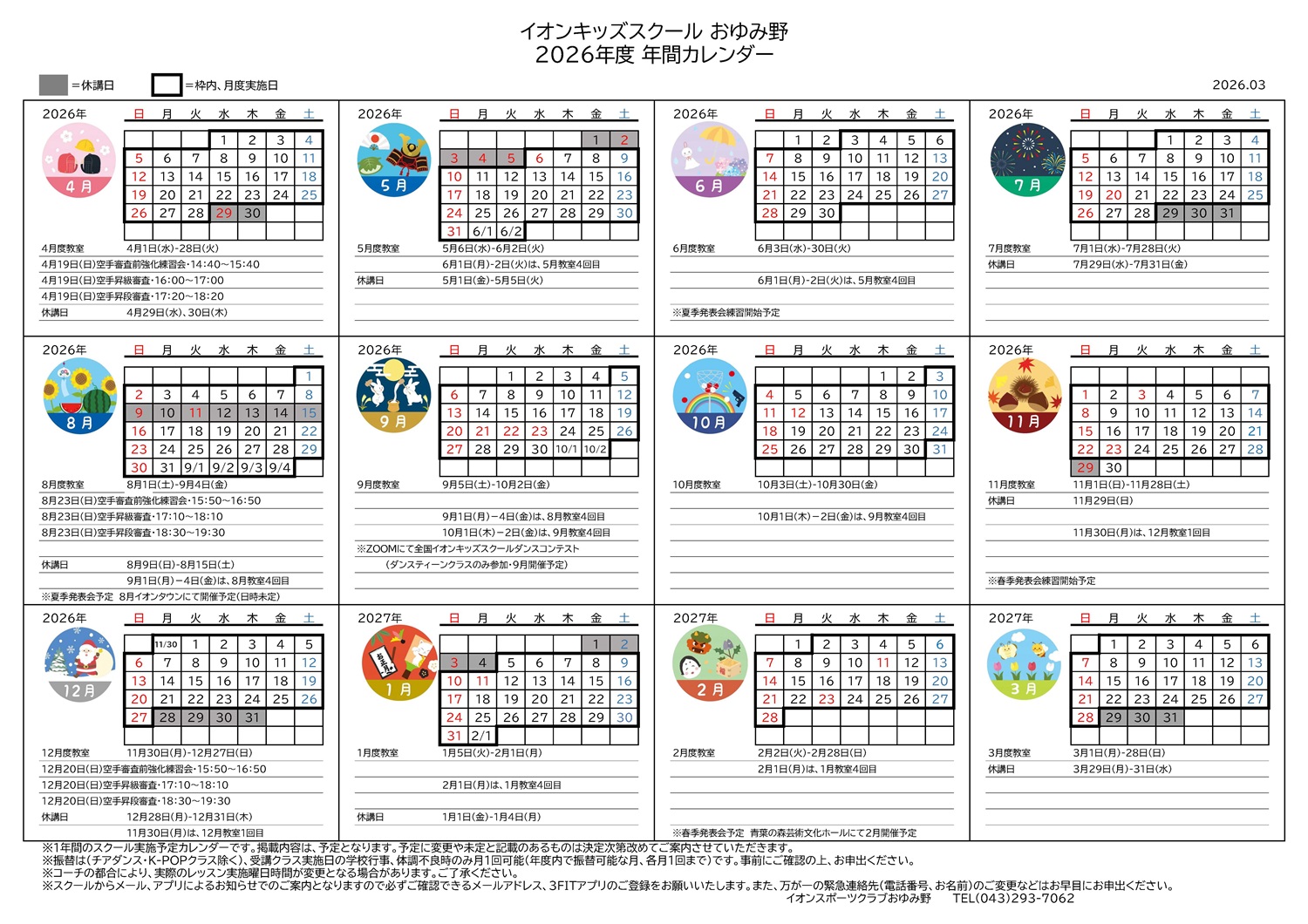 おゆみ野店 2026年度 キッズスクールカレンダー