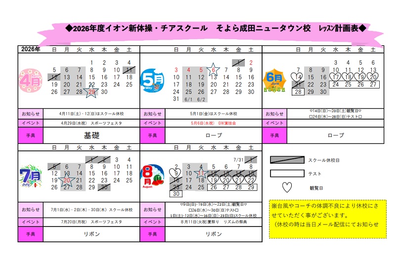 そよら成田ニュータウン校 2026年4~8月レッスン計画表