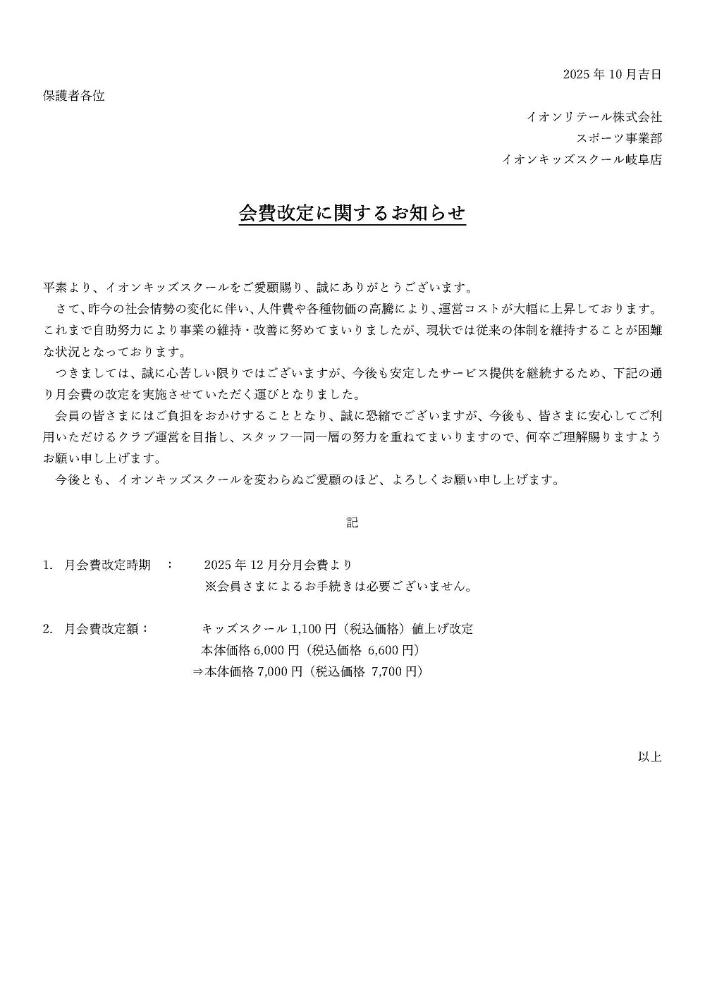イオンキッズスクール岐阜店 会費改定に関するお知らせ