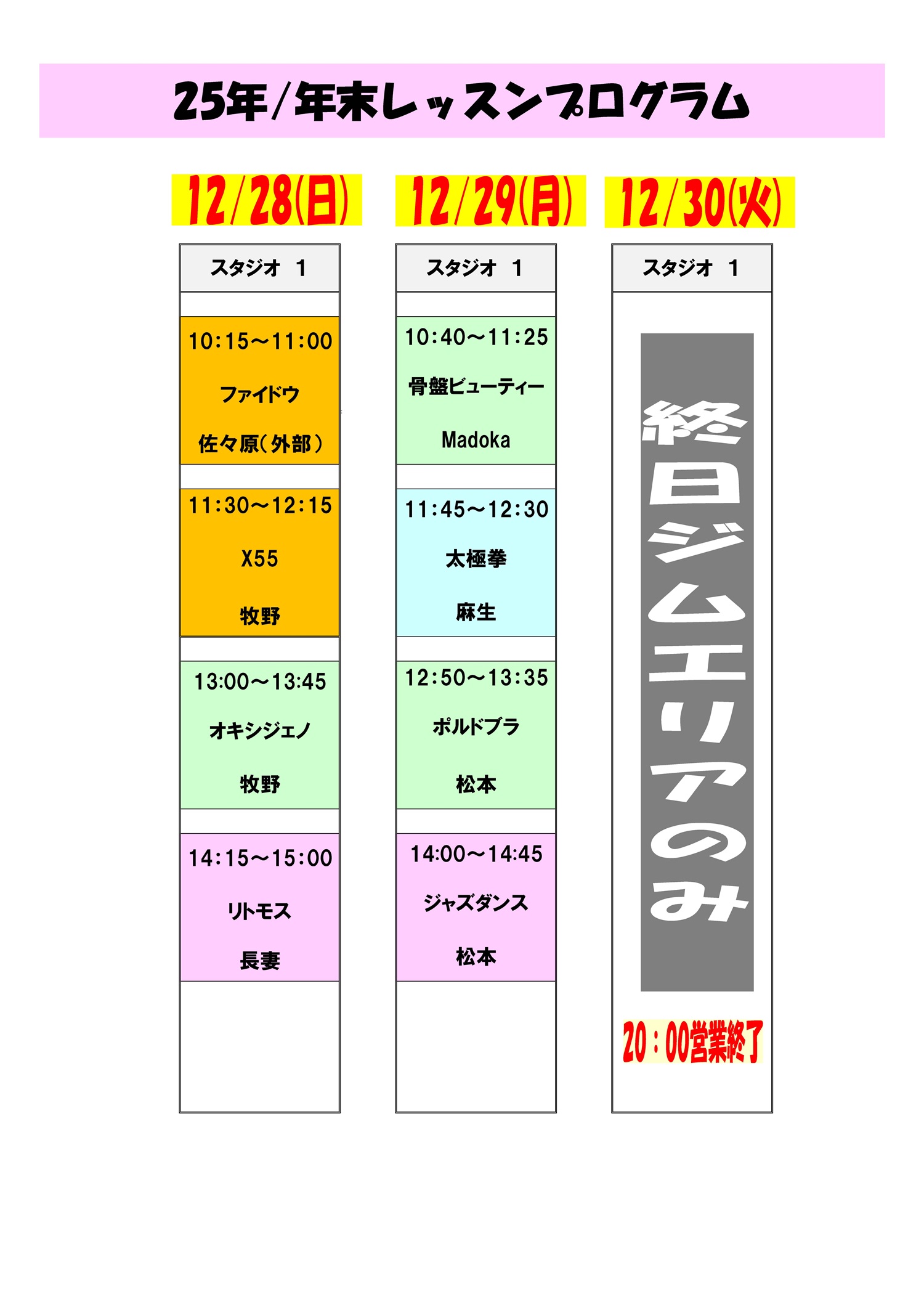レイクタウン店 年末レッスンスケジュール