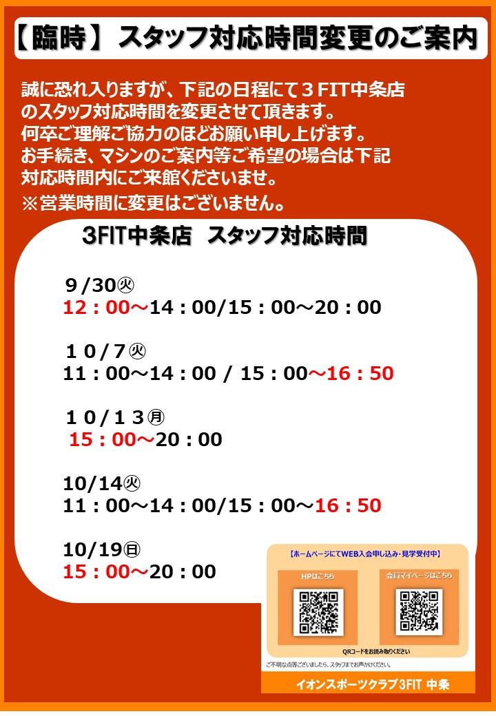 中条店【臨時】9月30日から10月19日 スタッフ対応時間時間変更のご案内