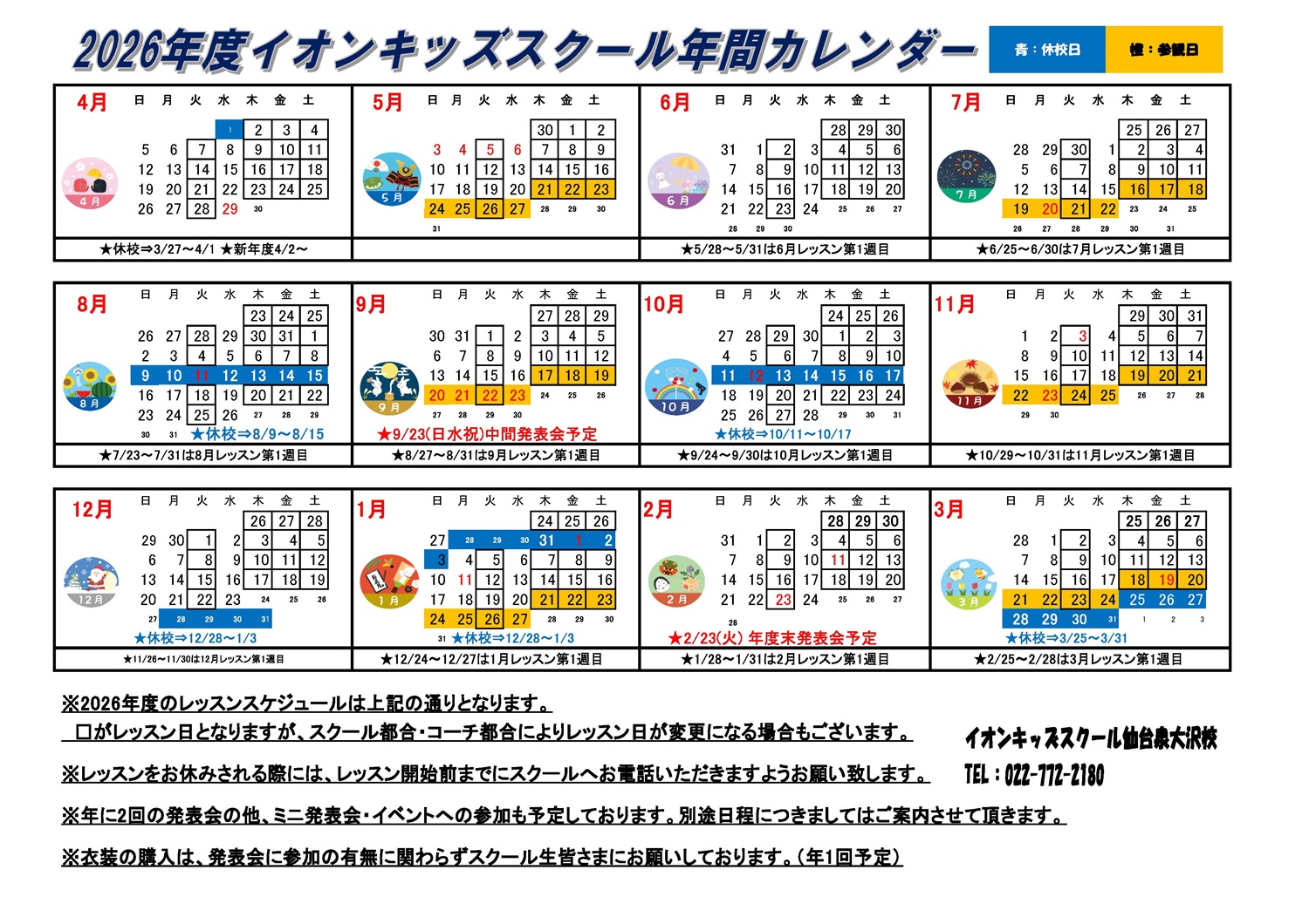 仙台泉大沢店 2026年キッズスクールカレンダー