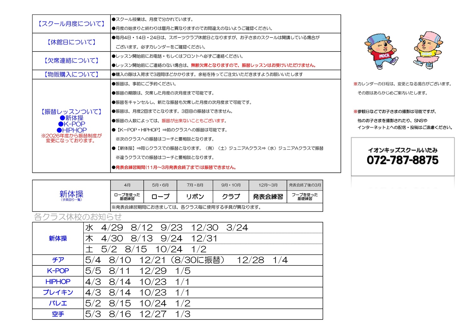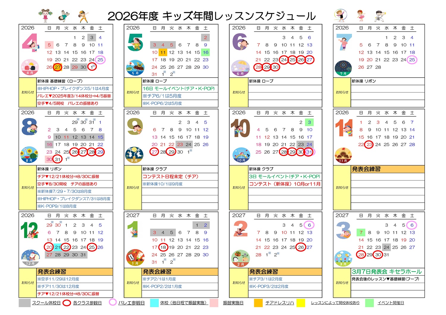 伊丹昆陽店 2026年度 キッズスクールカレンダー