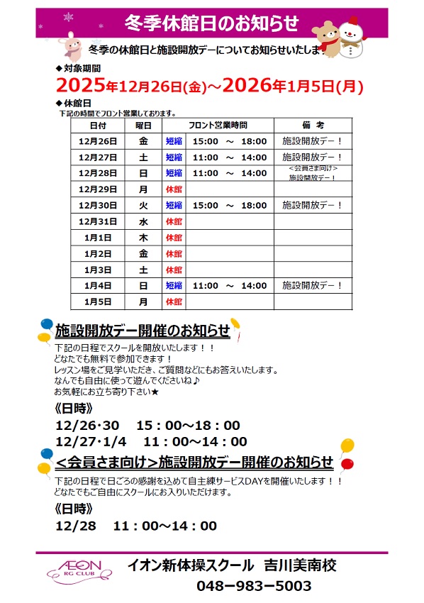 吉川美南校冬季休館日のお知らせ
