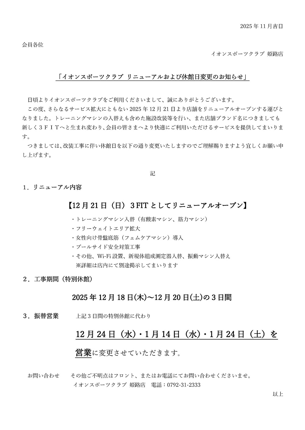 姫路店 リニューアルおよび休館日変更のお知らせ