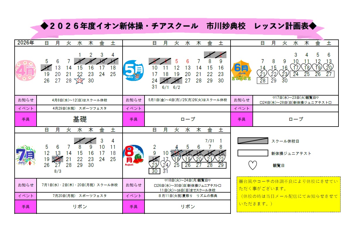 2026年4月~8月カレンダー☆