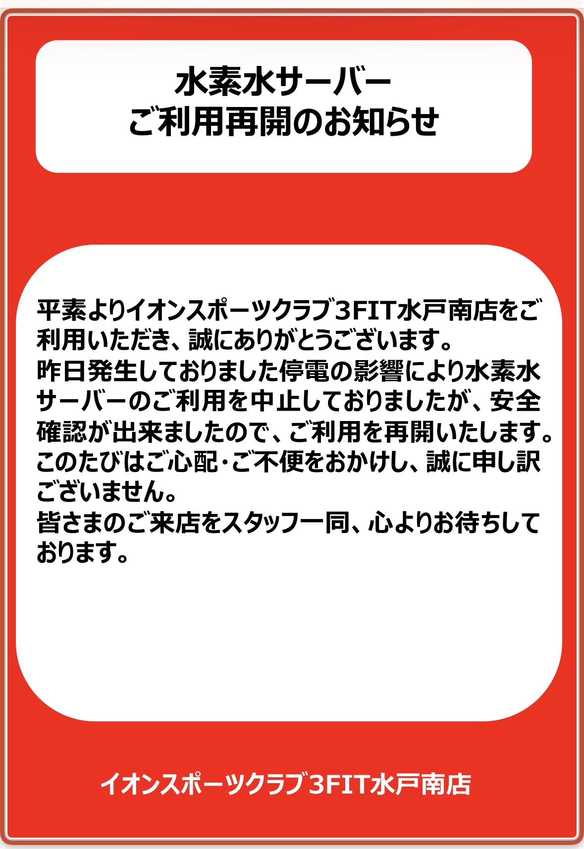 復旧【3FIT水戸南店】水素水サーバーご利用再開