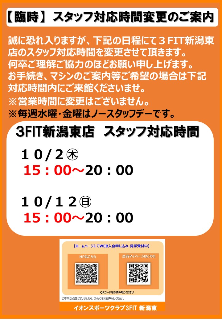 新潟東【臨時】10月2日、12日のスタッフ対応時間変更