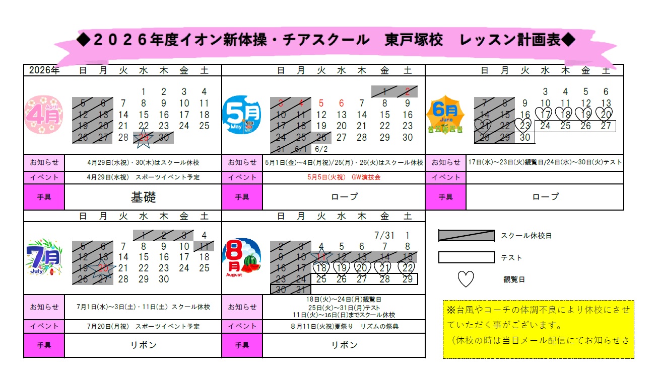 東戸塚校 4月~8月カレンダー