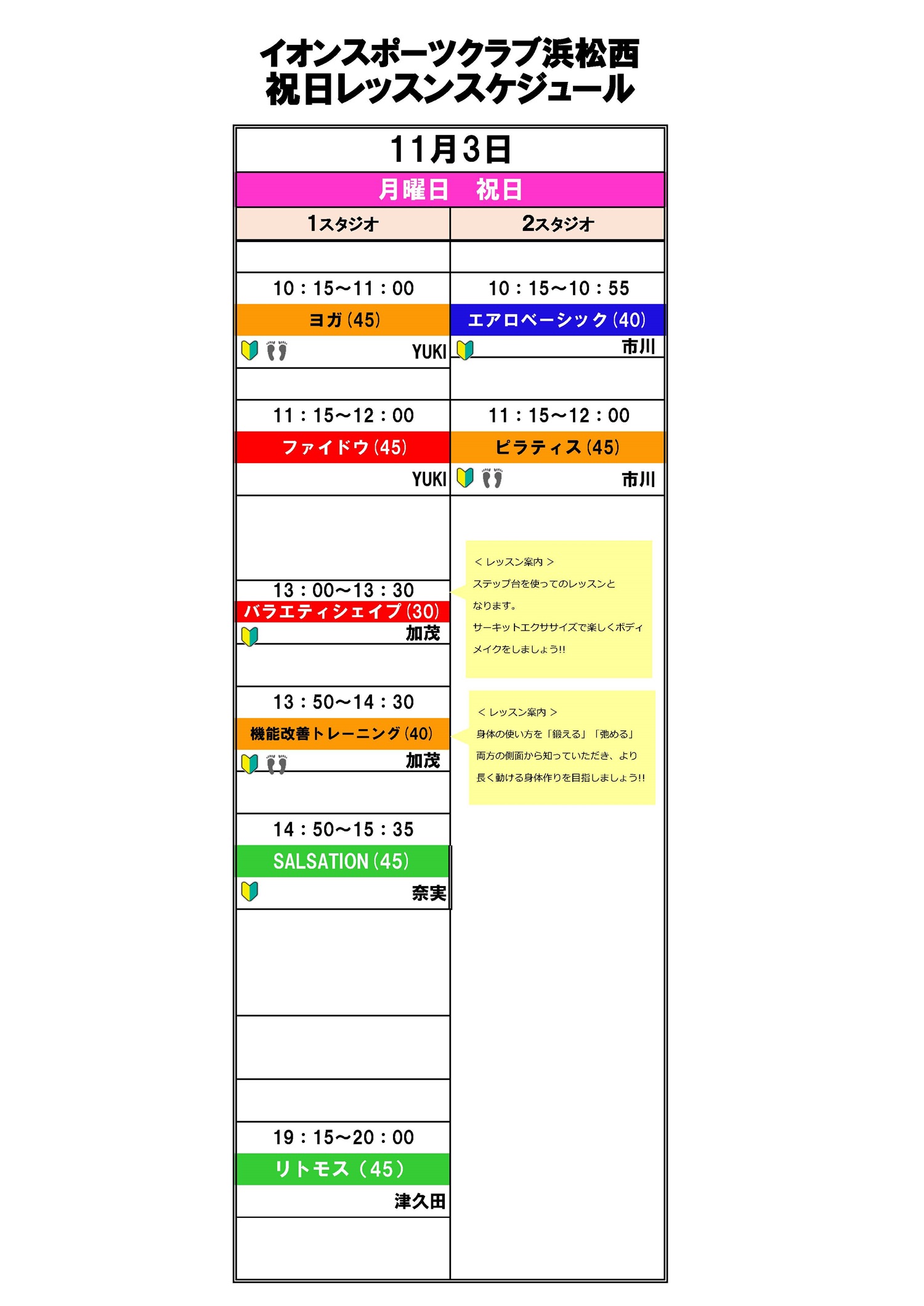 浜松西店 11/3(月・祝)祝日レッスンスケジュール