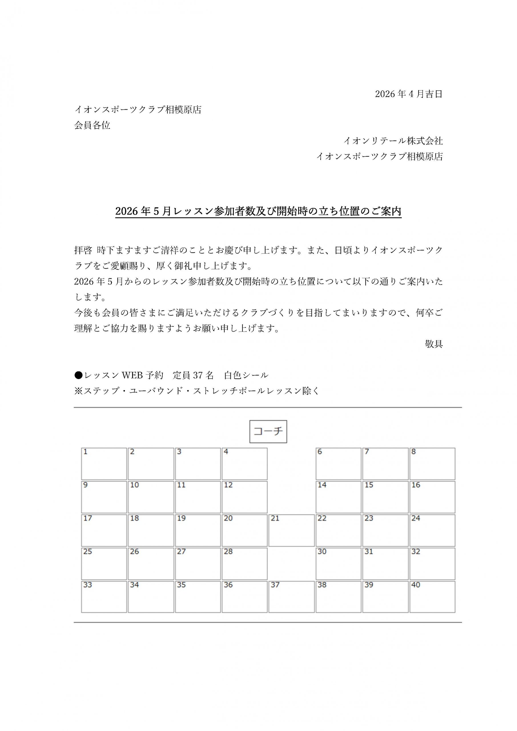 相模原店 2026年5月レッスン参加者数及び開始時の立ち位置のご案内