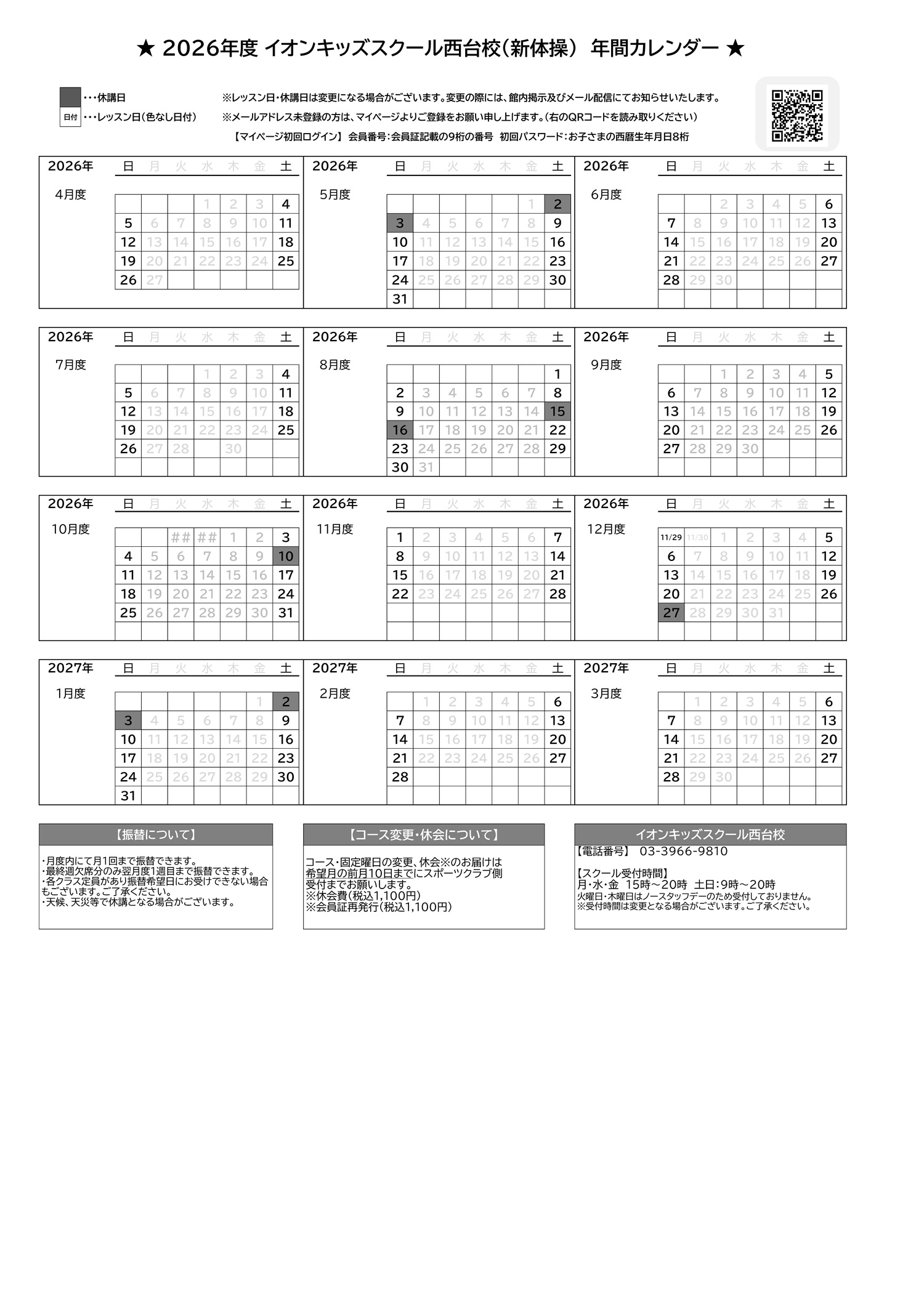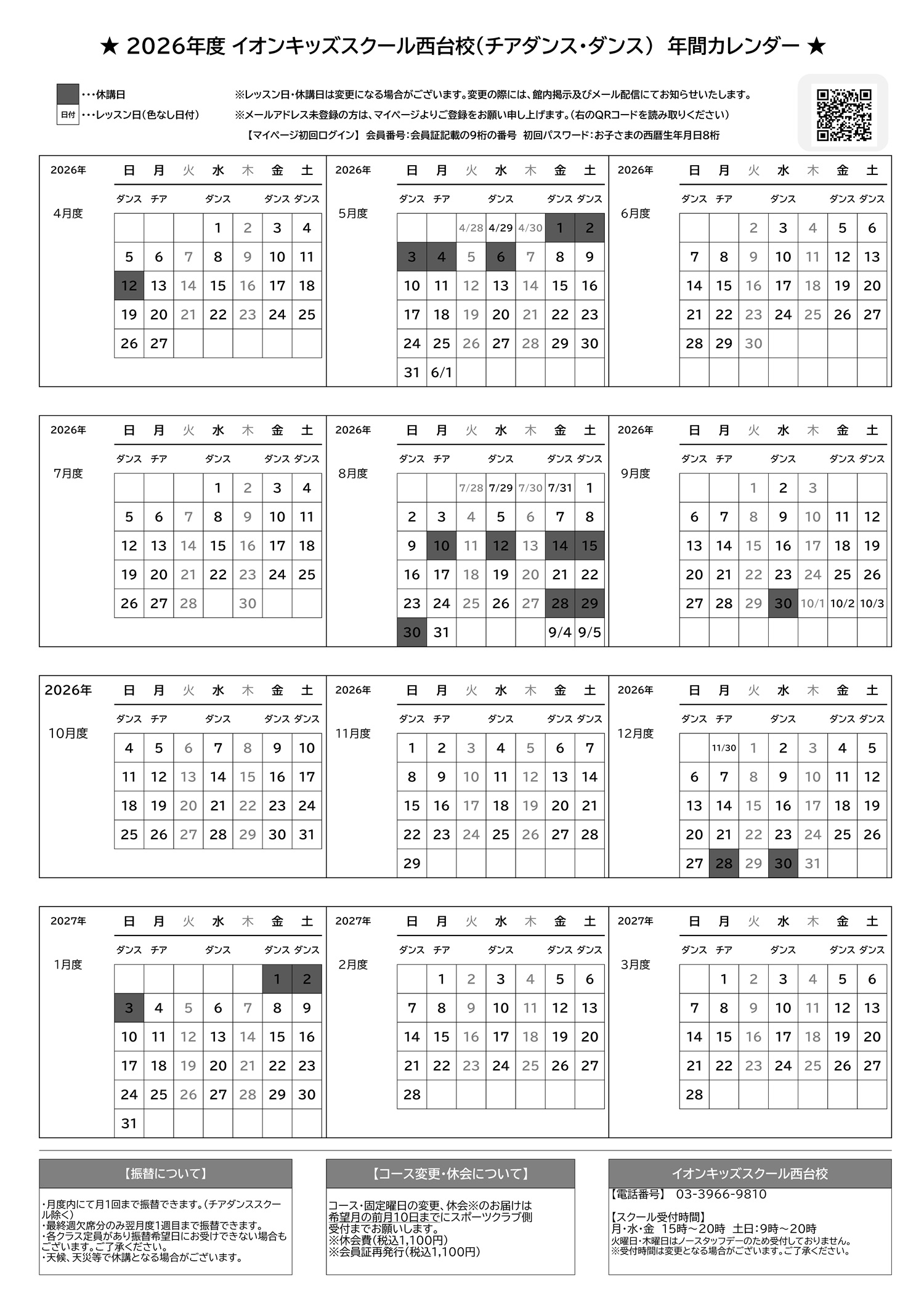 西台店 2026年キッズスクールカレンダー
