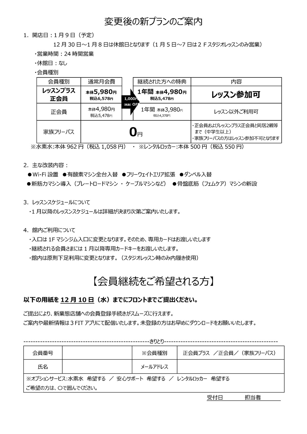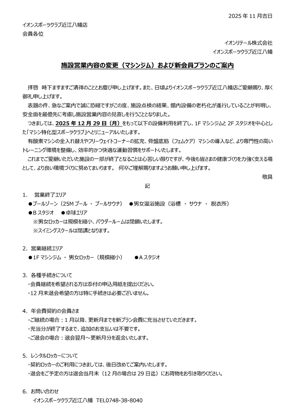 近江八幡店 施設営業内容の変更および新会員プランのご案内
