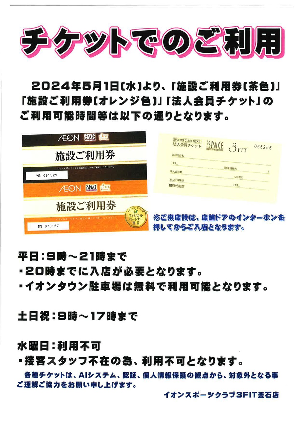釜石店 「施設ご利用券」ご利用可能時間につきまして