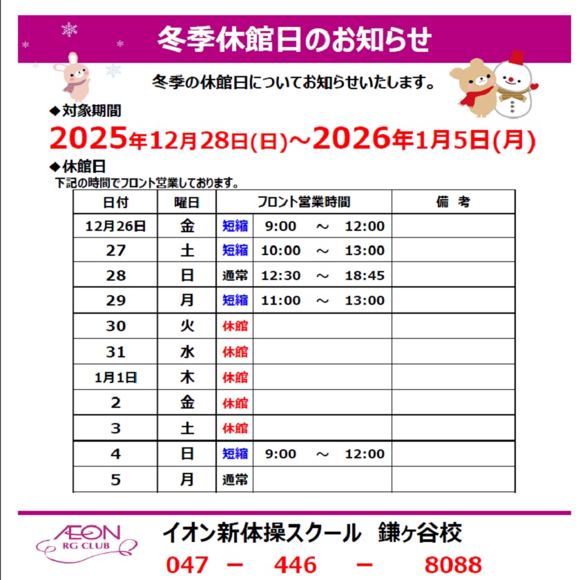 鎌ヶ谷校 年末年始休館日のお知らせ