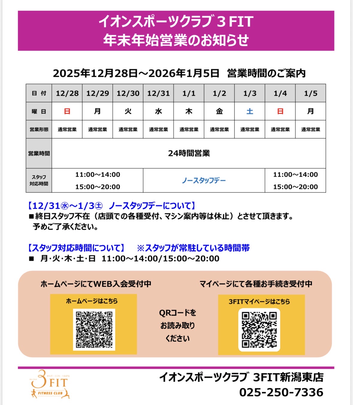 3FIT 【新潟東店】年末年始営業のお知らせ