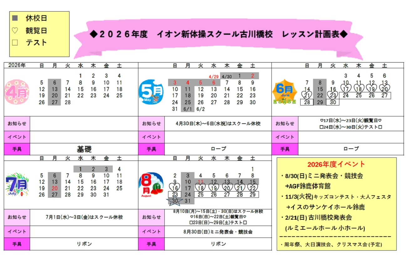 【古川橋校】2026年4月~8月 レッスンカレンダー