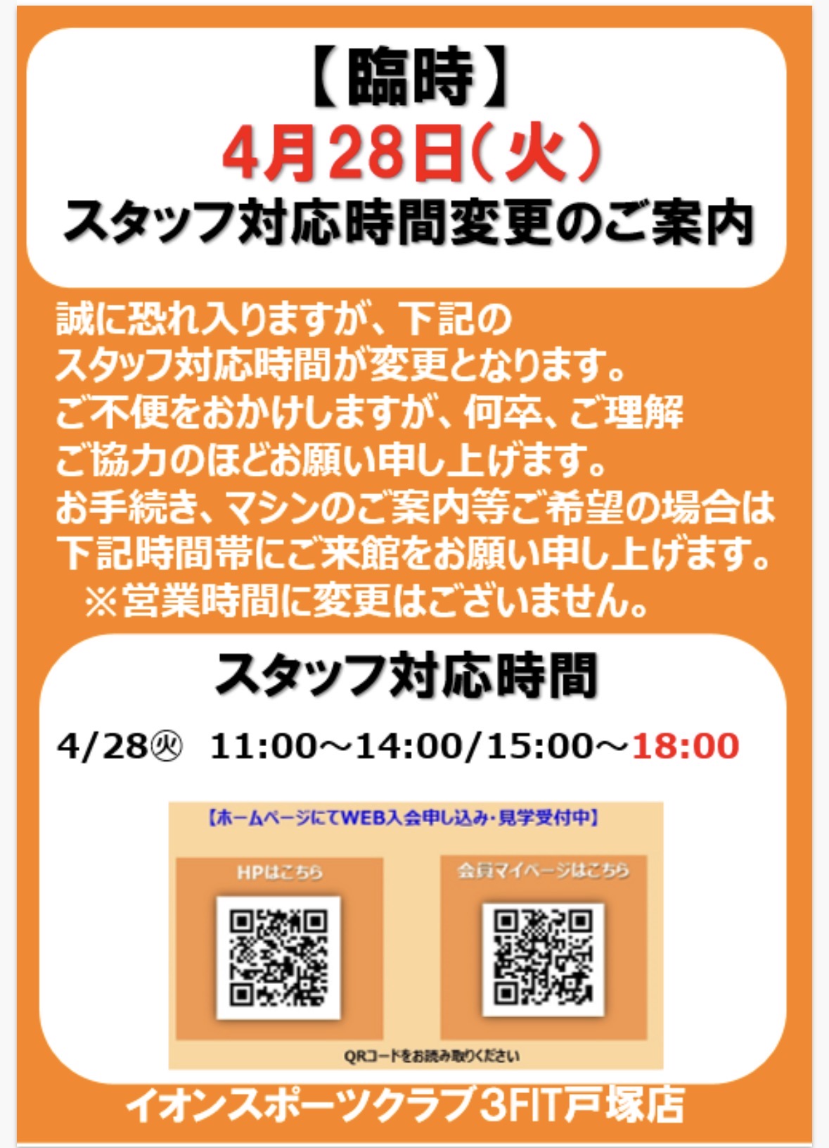 【臨時】 4月28日(火) スタッフ対応時間変更のご案内