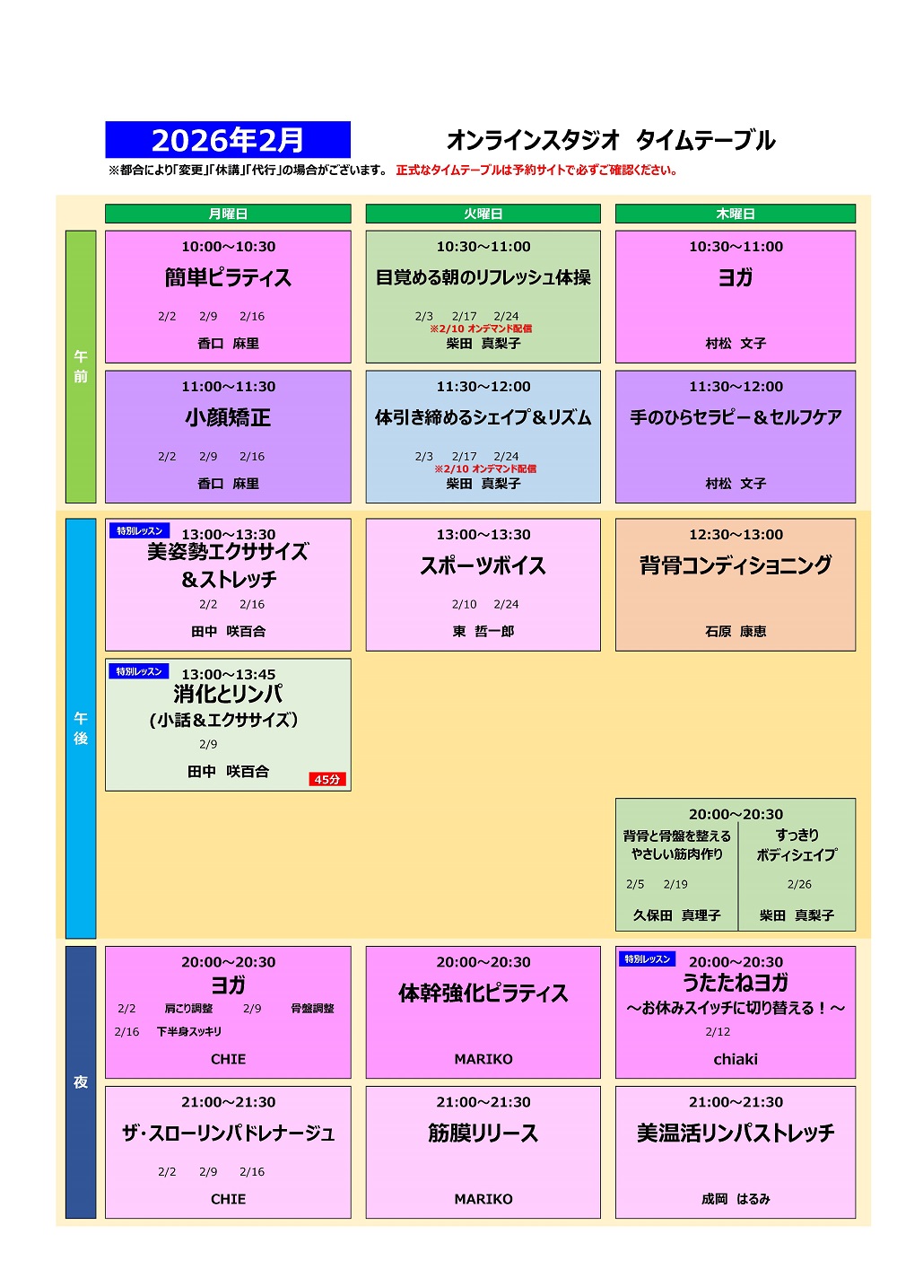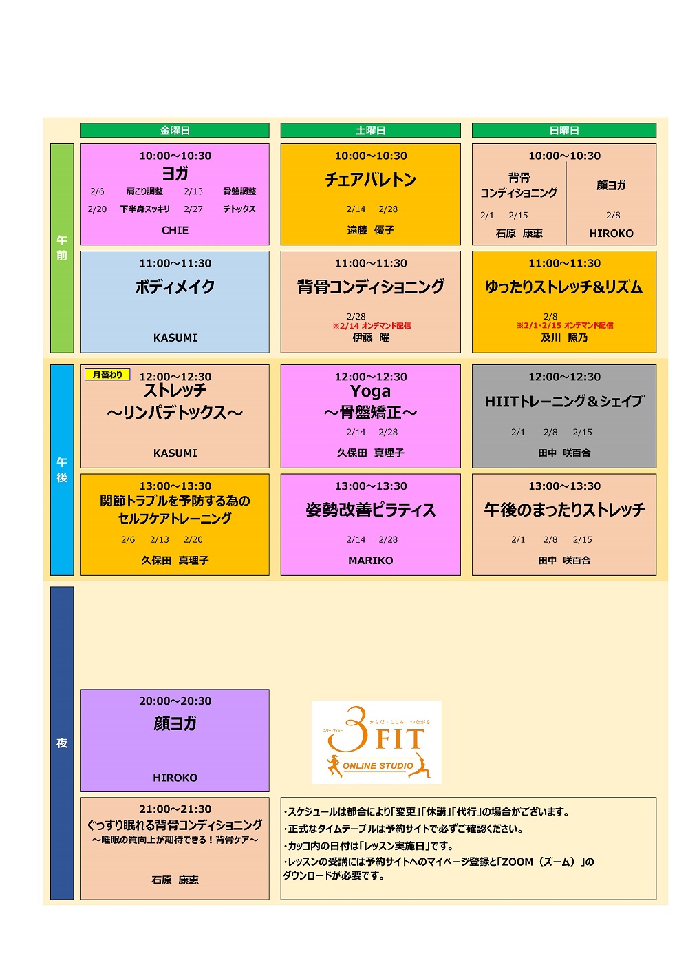 【3FITオンラインスタジオ】レッスンタイムテーブル2月