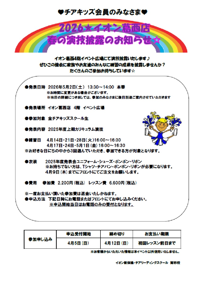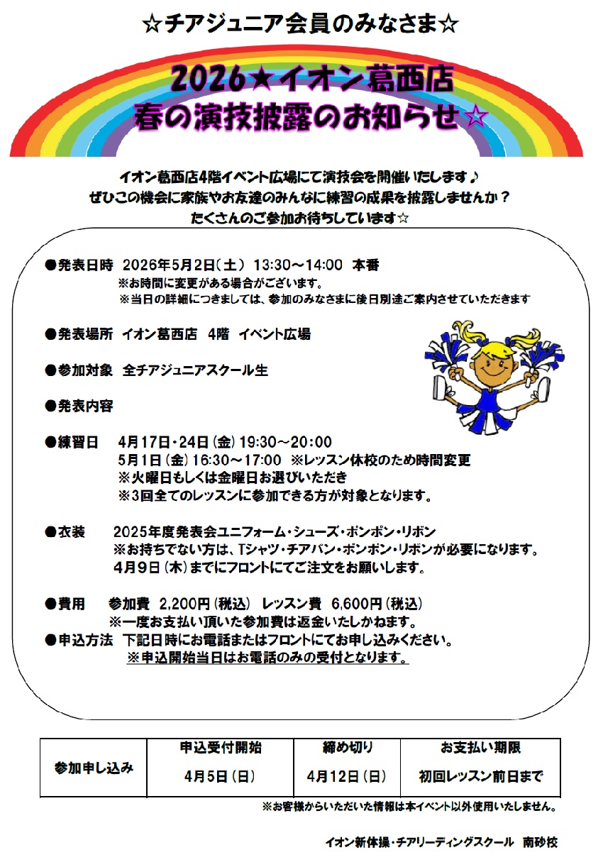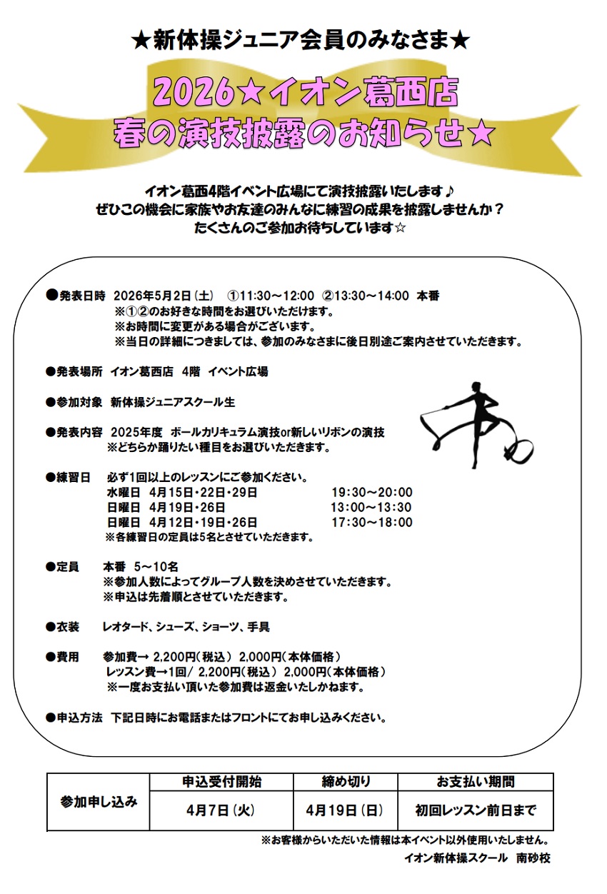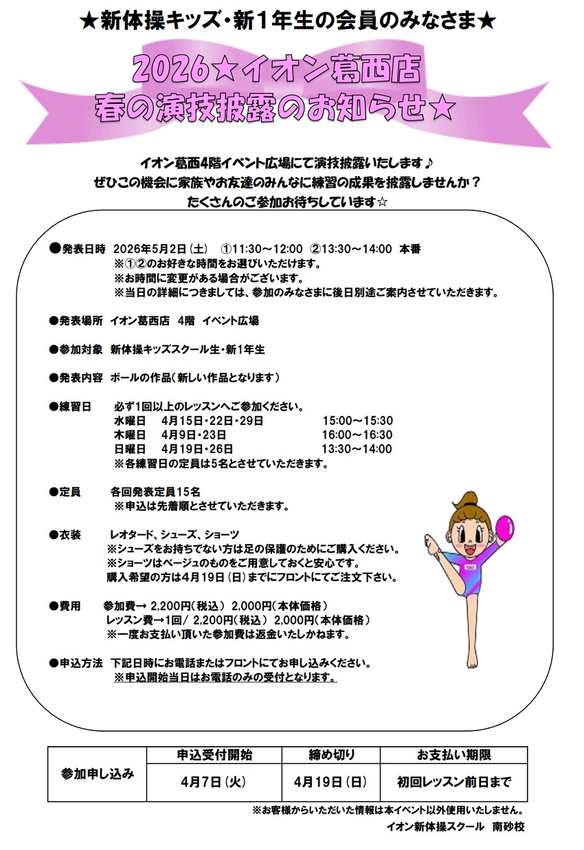 南砂校 5月2日イオン葛西店演技披露会のお知らせ