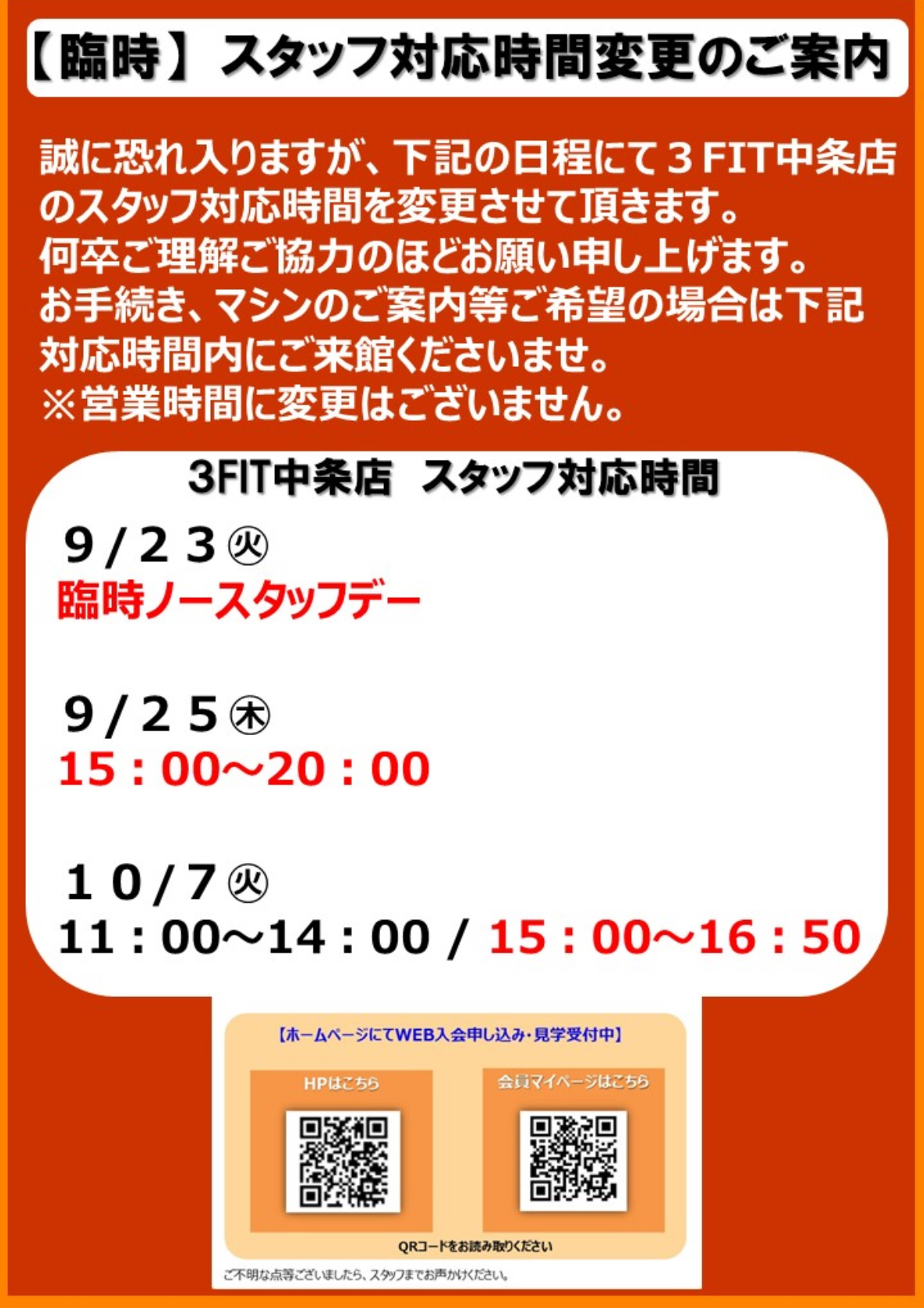 3FIT中条【臨時】 スタッフ対応時間変更のご案内