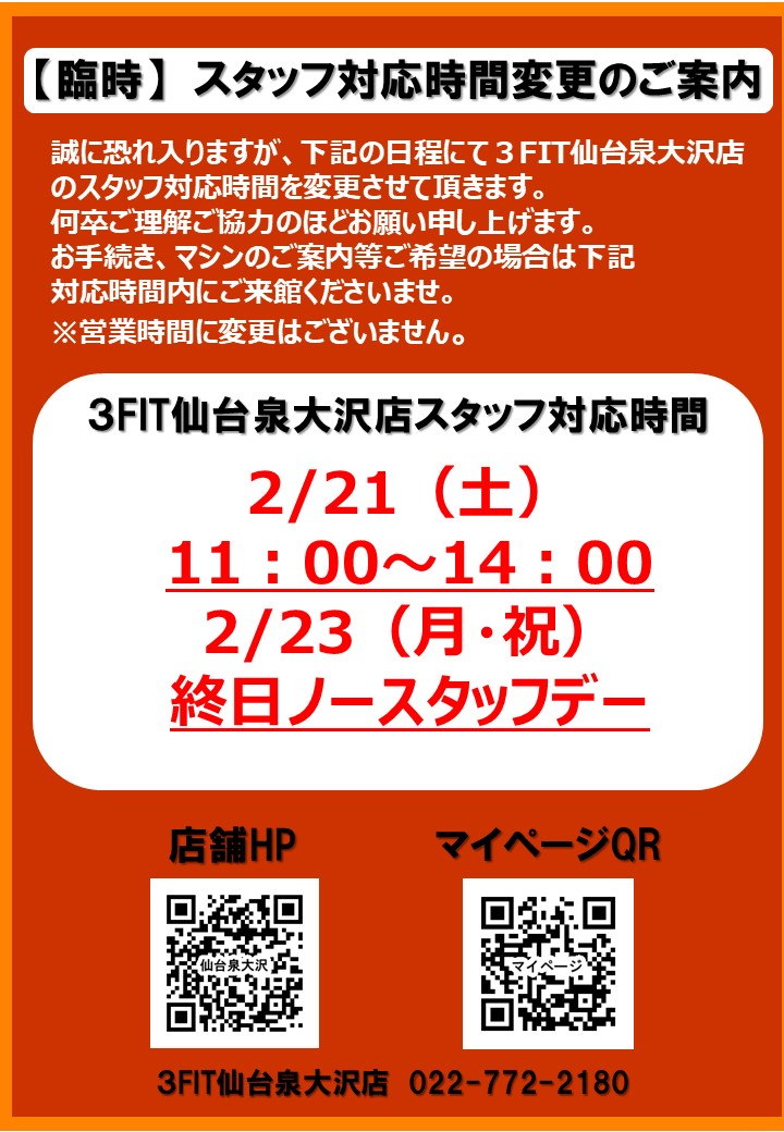 3FIT仙台泉大沢店 【臨時】 スタッフ対応時間変更のご案内