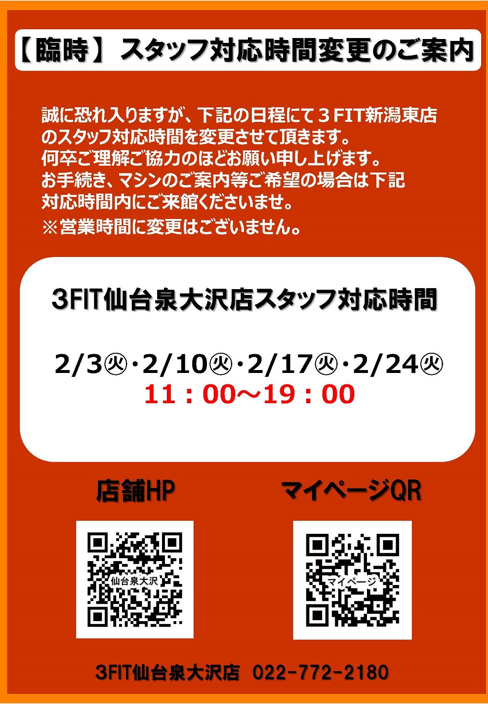 3FIT仙台泉大沢店 【臨時】スタッフ対応時間変更のご案内