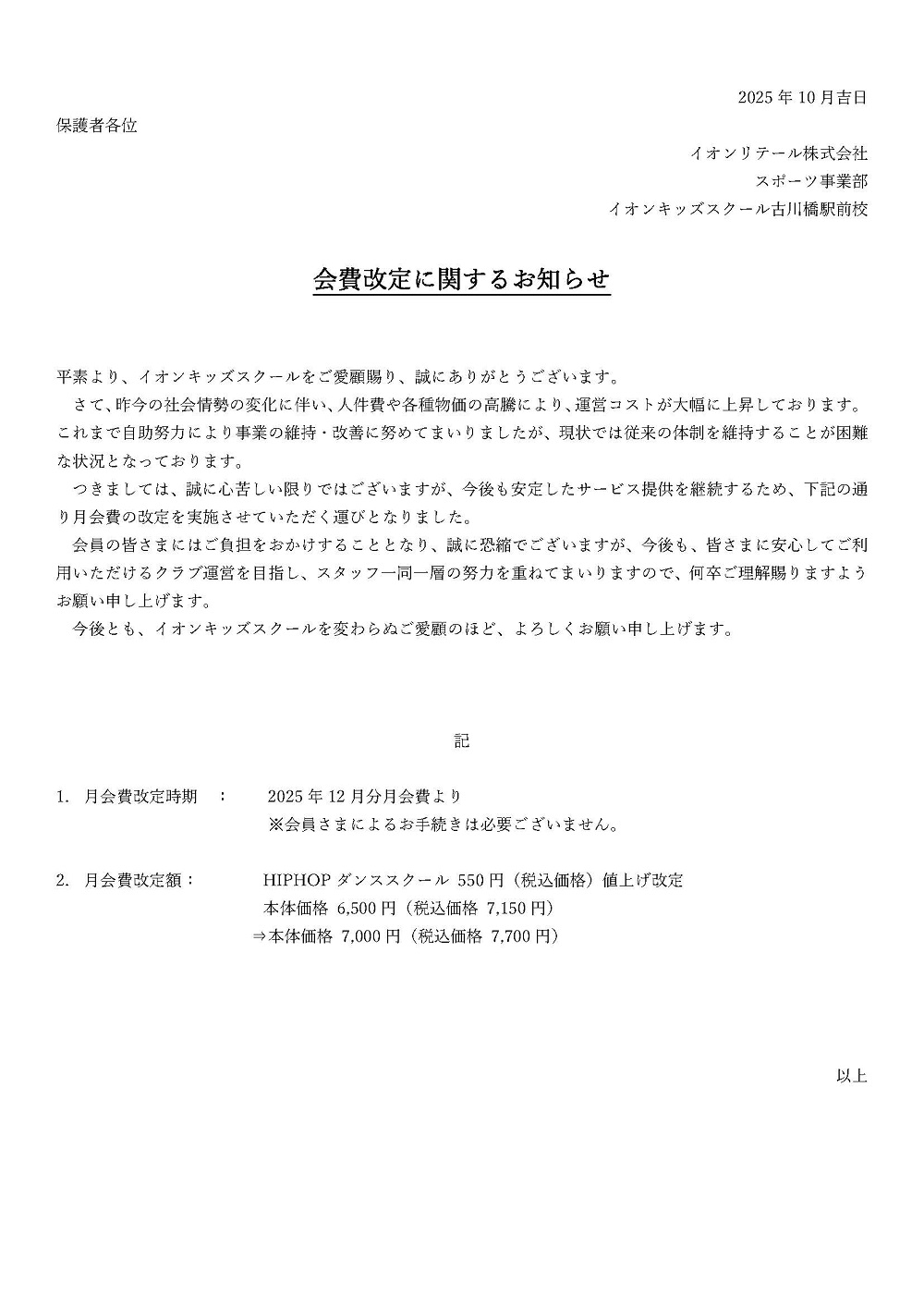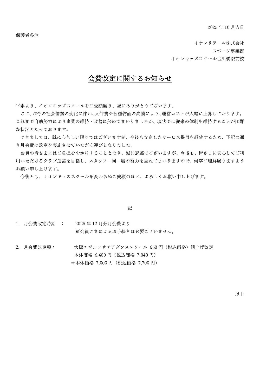 3FIT古川橋駅前店 会費改定に関するお知らせ