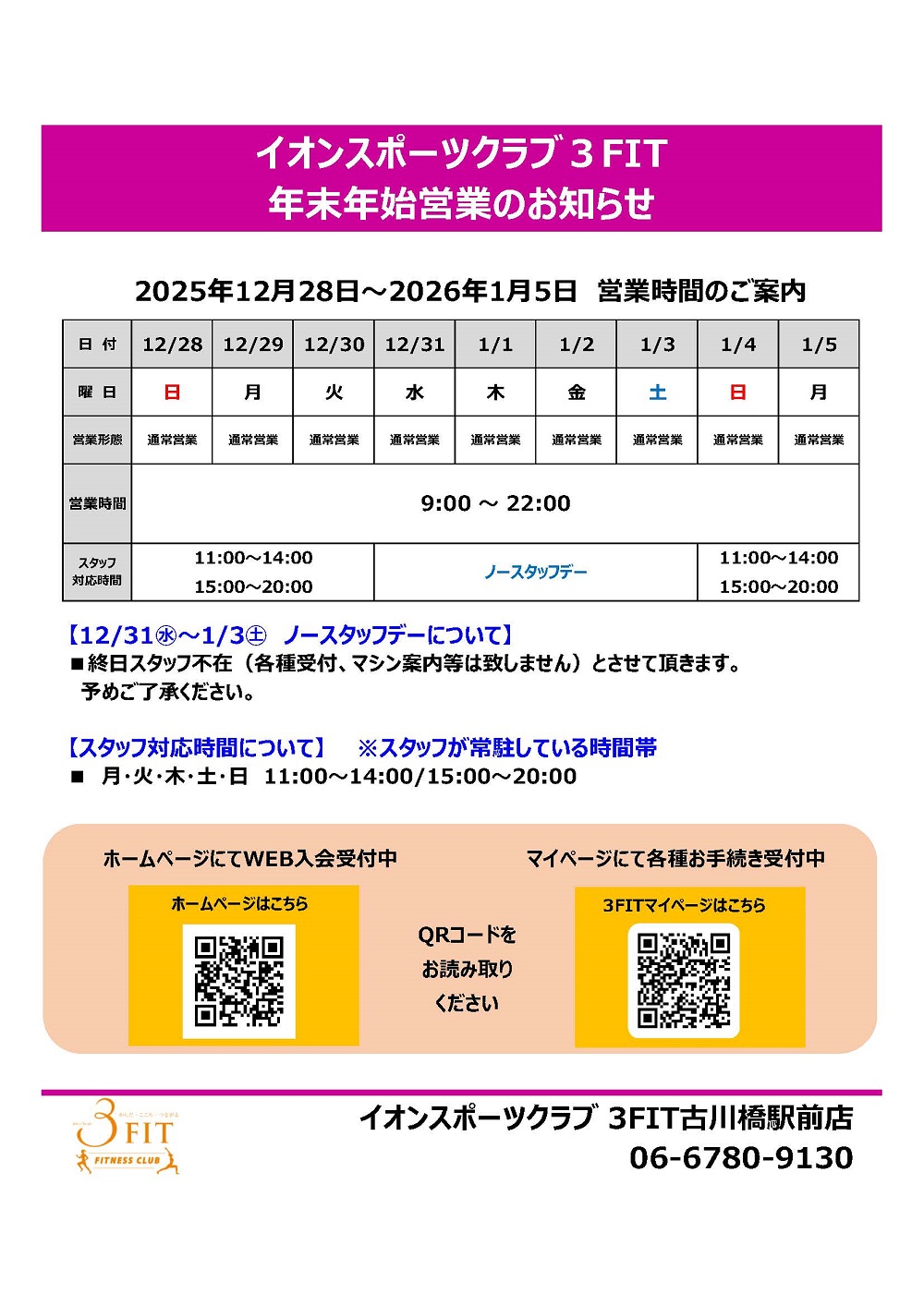 3FIT古川橋駅前店 年末年始営業時間のご案内