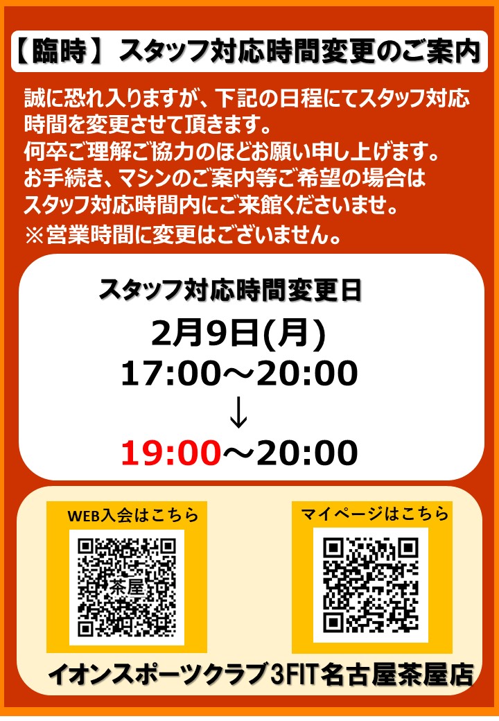 3FIT名古屋茶屋【臨時】2月9日㊊スタッフ対応時間変更のご案内