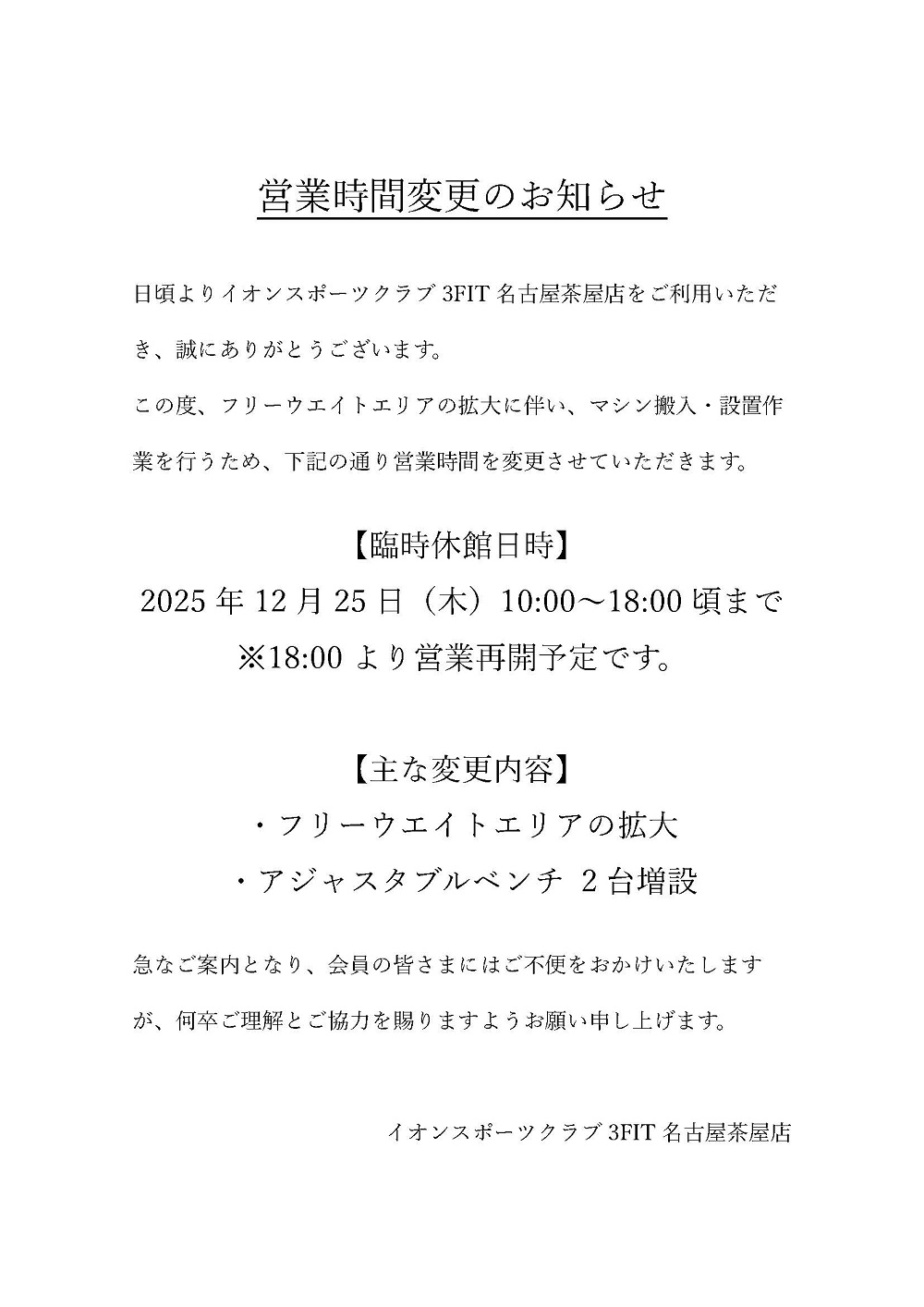 3FIT名古屋茶屋店 【臨時】営業時間変更のお知らせ