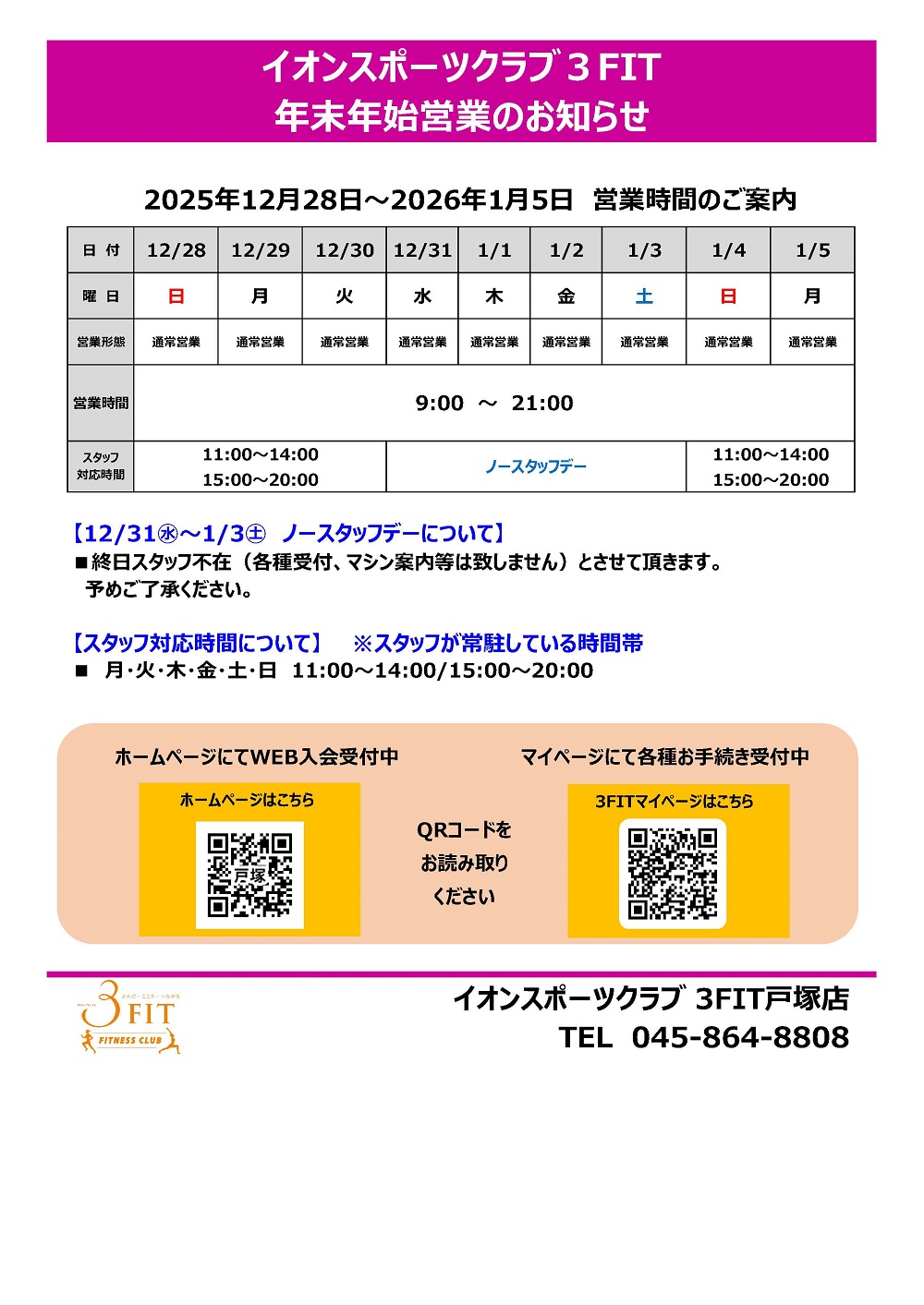 3FIT戸塚店 年末年始営業時間のお知らせ