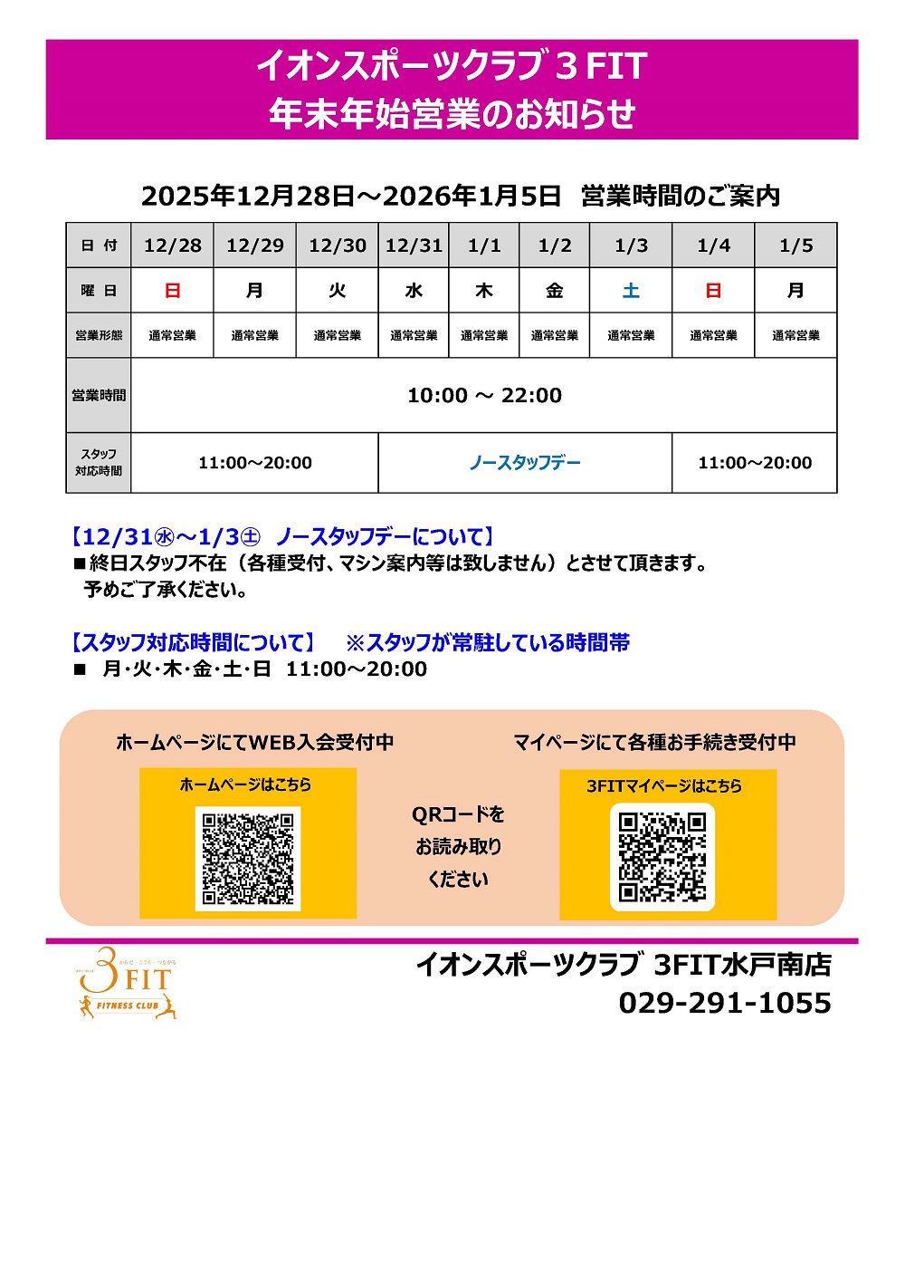 3FIT水戸南店 年末年始営業時間のご案内