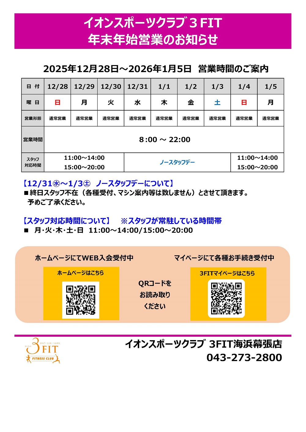 3FIT海浜幕張店 年末年始営業時間のご案内