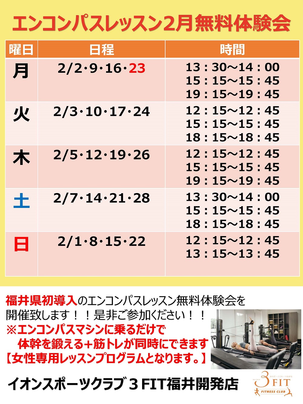 3FIT福井開発店 2月度エンコンパスレッスン無料体験会のお知らせ