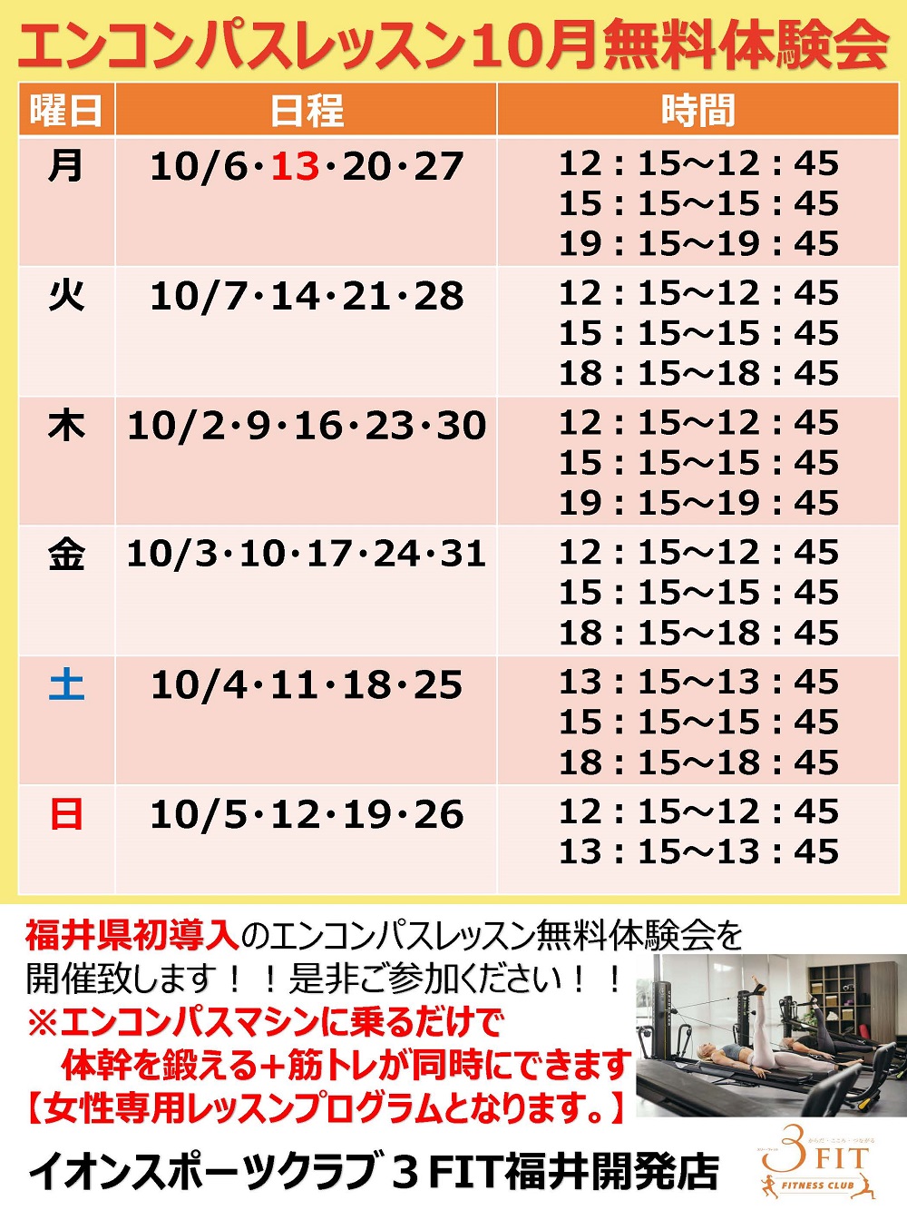 3FIT福井開発店 10月度エンコンパスレッスン無料体験会のお知らせ