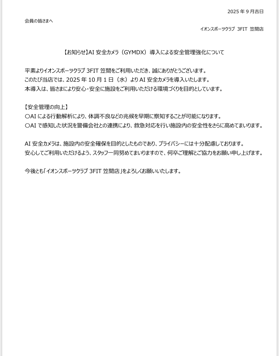 【お知らせ】AI 安全カメラ(GYMDX)導入による安全管理強化について