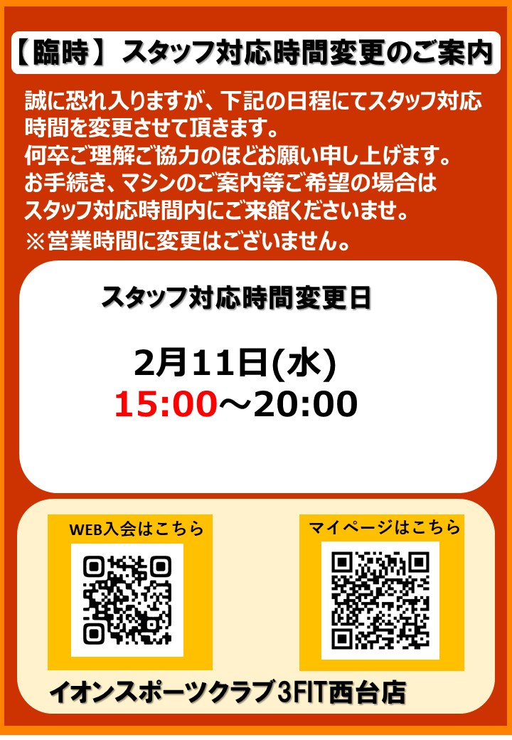3FIT西台店 【急遽】2月11日(水)スタッフ対応時間及びレッスン休講のご案内