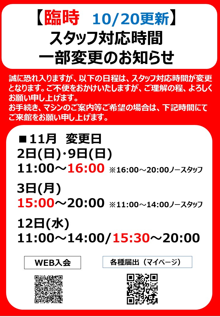 3FIT西台【臨時 10/20更新】 スタッフ対応時間 一部変更のお知らせ